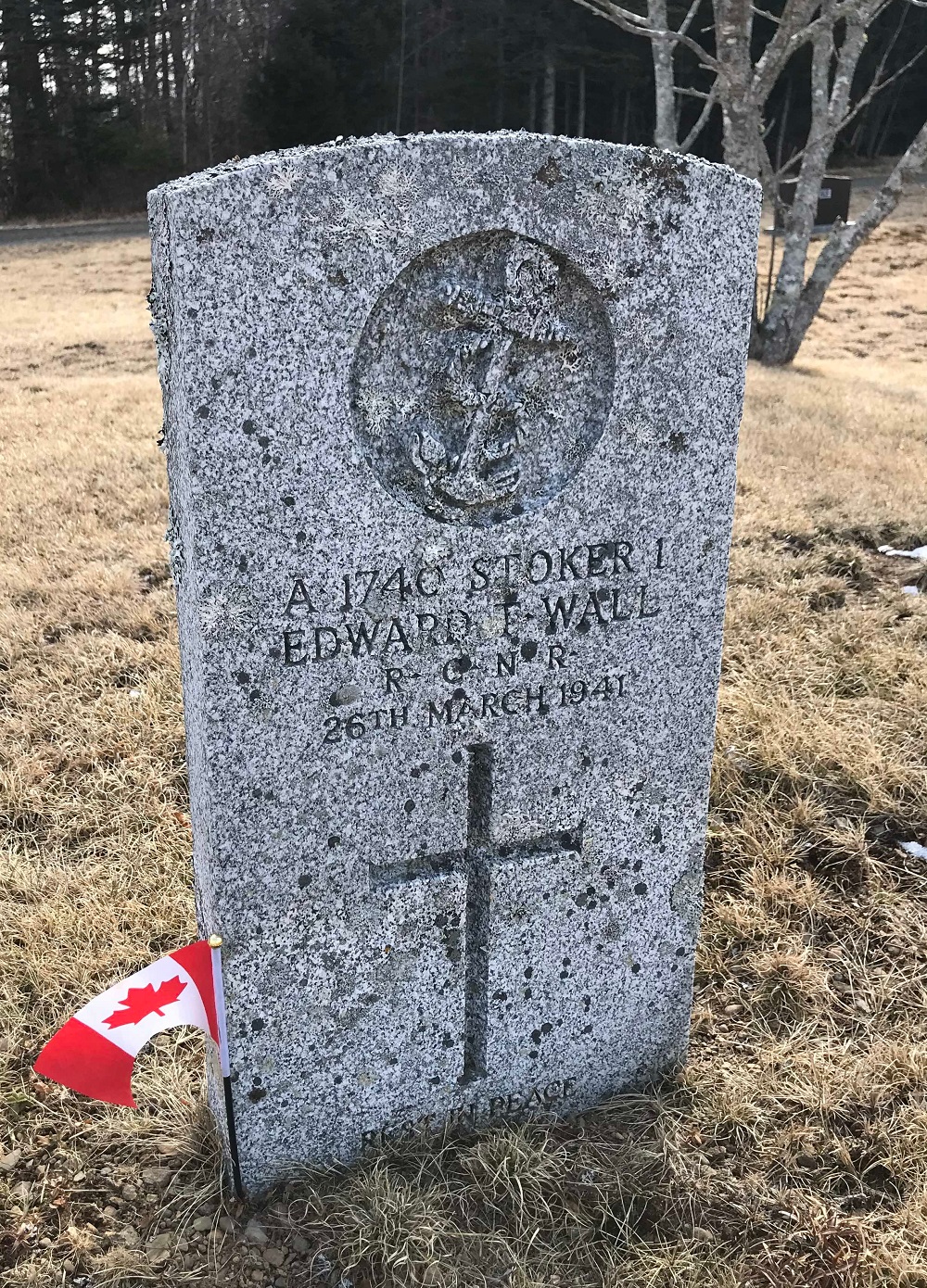 Stoker Wall died in the sinking of HMCS OTTER when she caught fire and burned while on patrol near Halifax. He is buried in the Bleumortier Cemetery, Castalia, New Brunswick