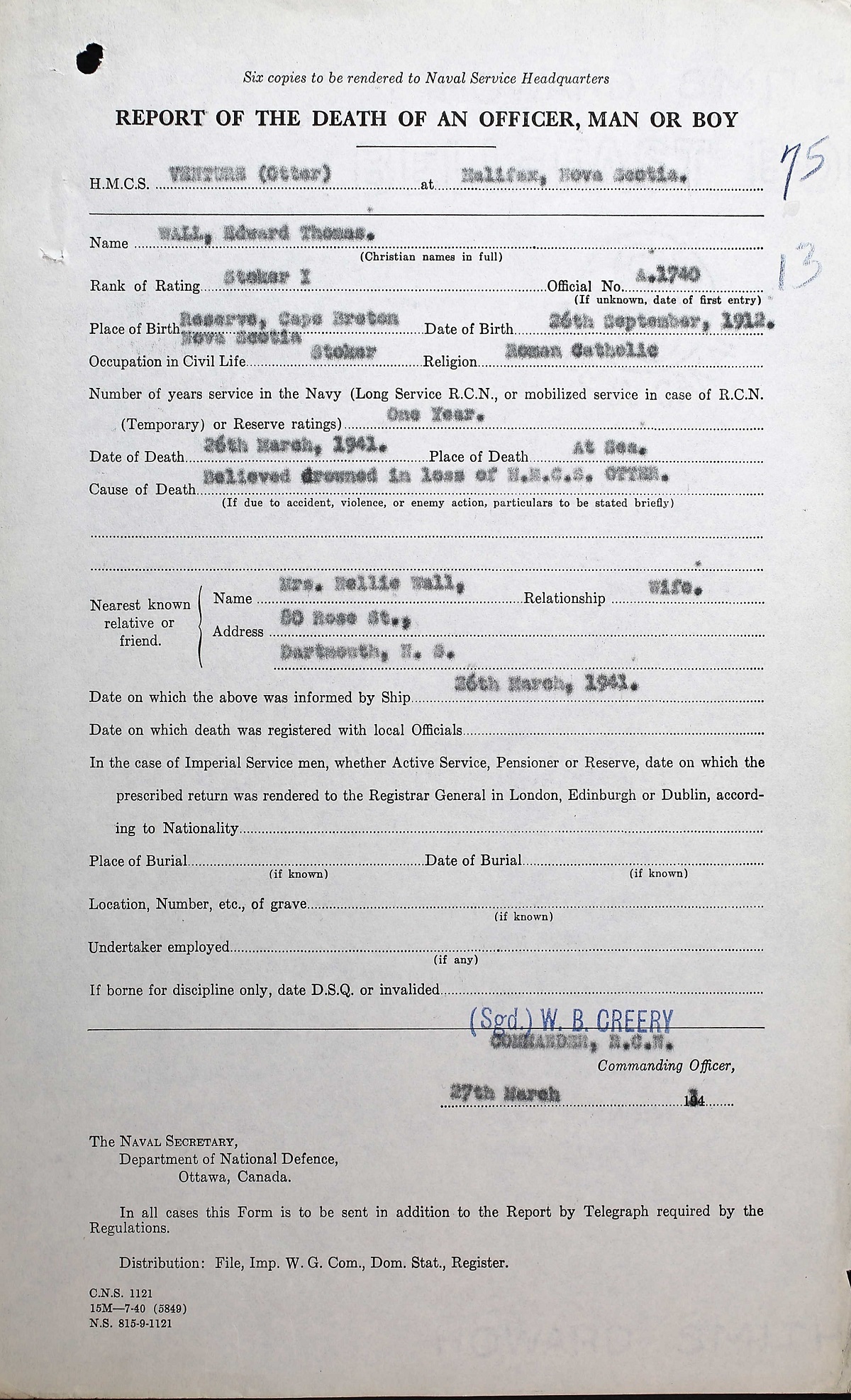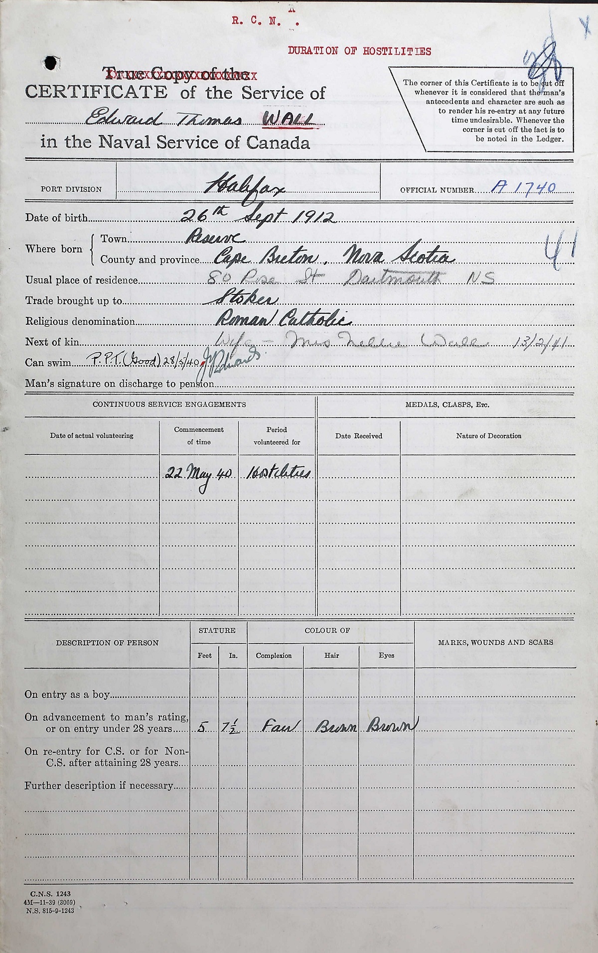 WALL, Edward Thomas, Sto 1c, A1740, RCNR, killed - 26 Mar 1941, HMCS OTTER - Husband of Nellie Wall, of Dartmouth, Nova Scotia.