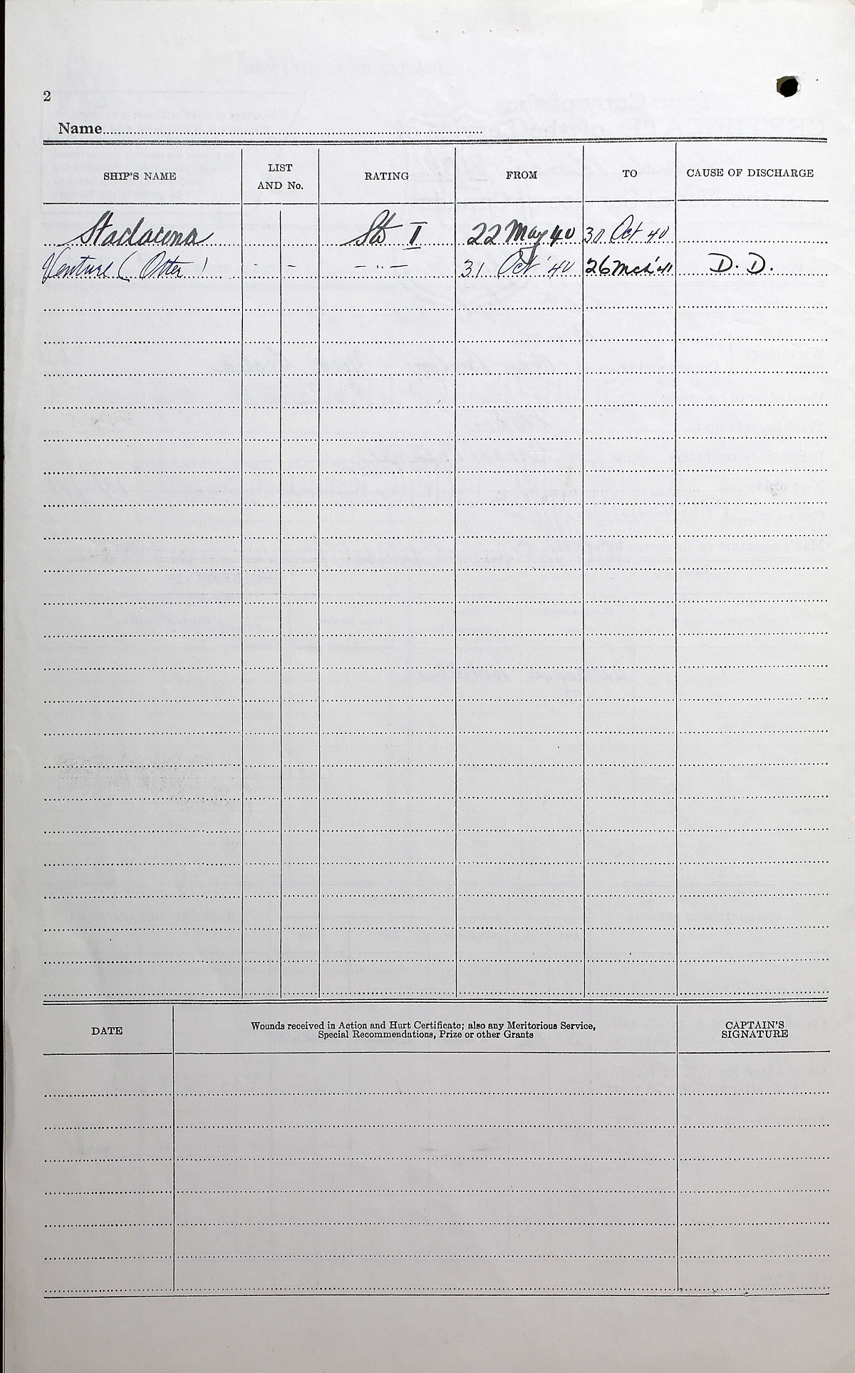 Ships served in: HMCS STADACONA - Enlisted 22 May 1940 as a Sto 1c, RCNVR HMCS OTTER - Drafted to OTTER 31 Oct 1940 as a Sto 1c, RCNVR