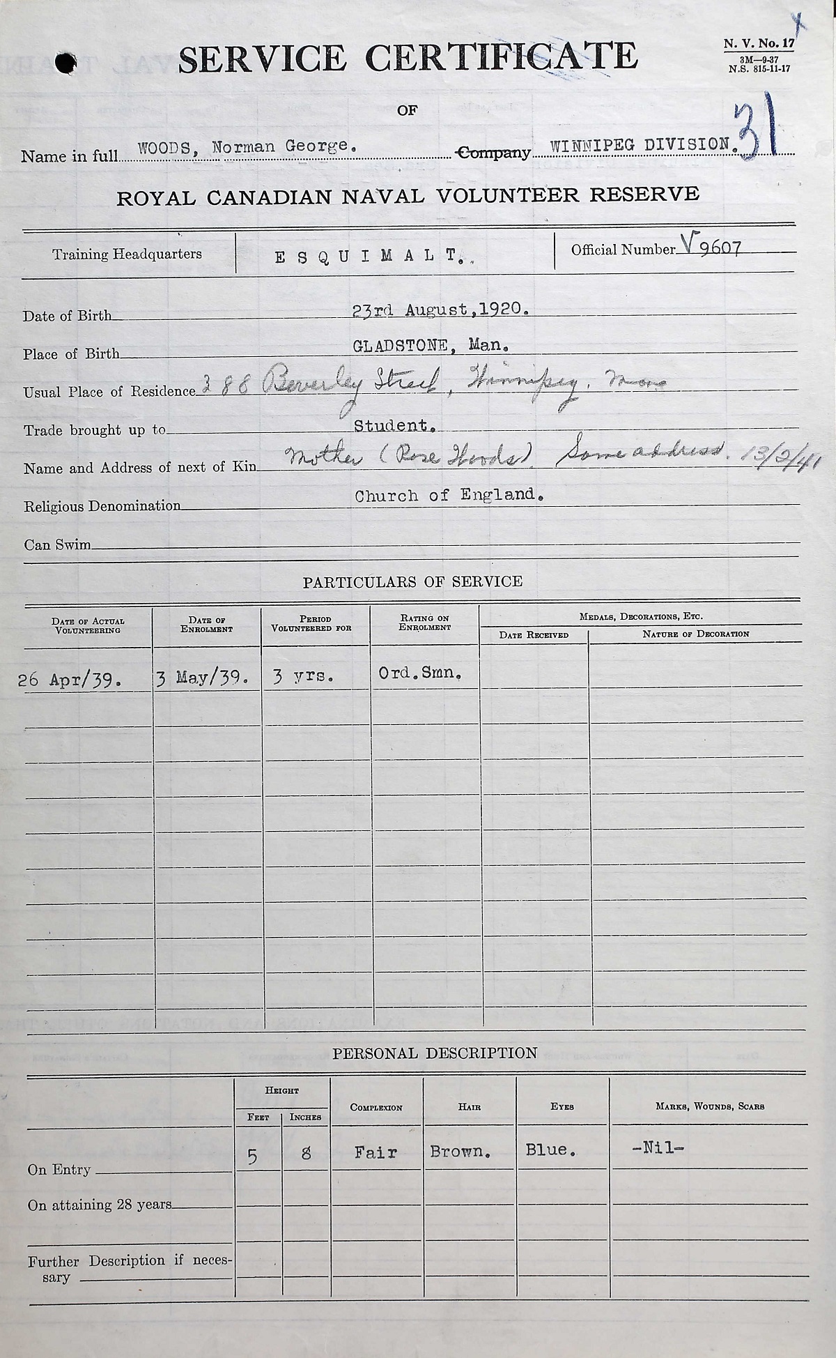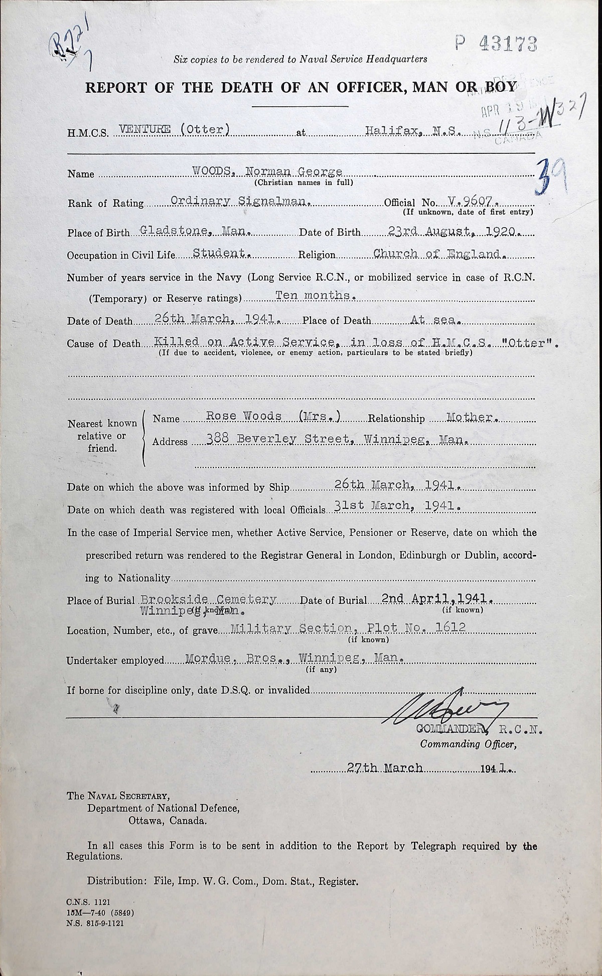 WOODS, Norman George, OS, V9607, RCNVR, killed - 26 Mar 1941, HMCS OTTER - Son of Rose Woods, of Winnipeg.