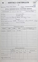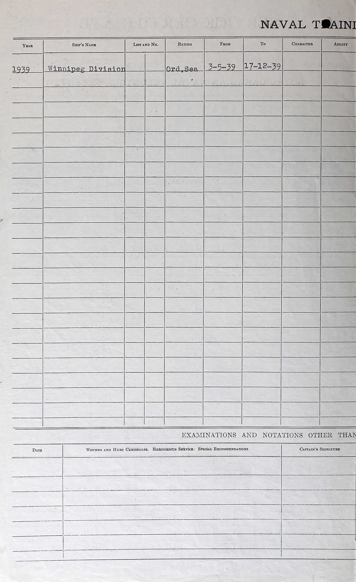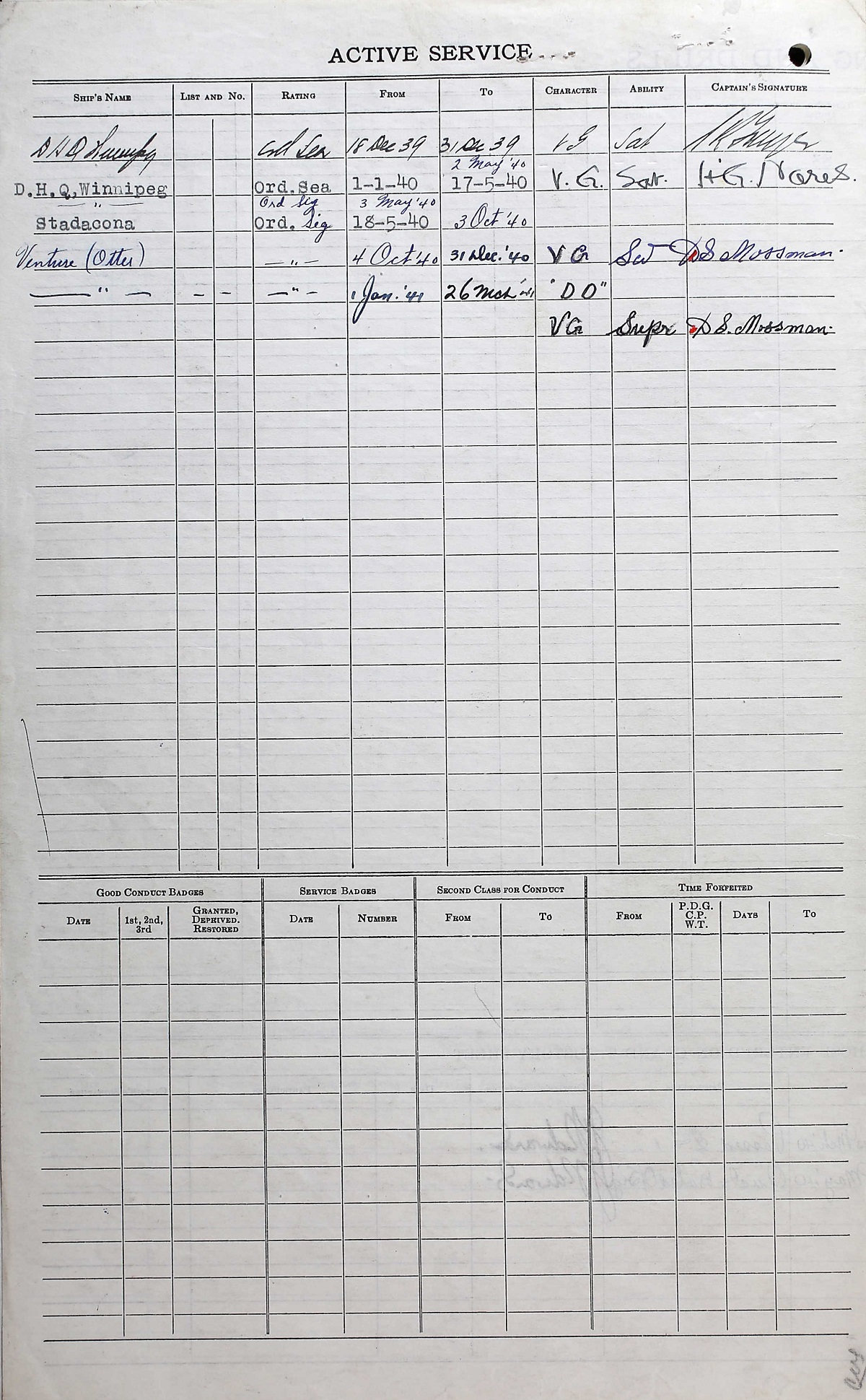 Ships served in: WINNIPEG DIVISION RCNVR - Enlisted - peacetime service - 03 May 1939 as an OS, RCNVR WINNIPEG DIVISION RCNVR - Commenced Active Service 18 Dec 1939 as an OS, RCNVR. Rated O/Sig 03 May 1940 HMCS STADACONA - Drafted to STADACONA 18 May 1940 as an O/Sig, RCNVR HMCS OTTER - Drafted to OTTER 04 Oct 1940 as an O/Sig, RCNVR