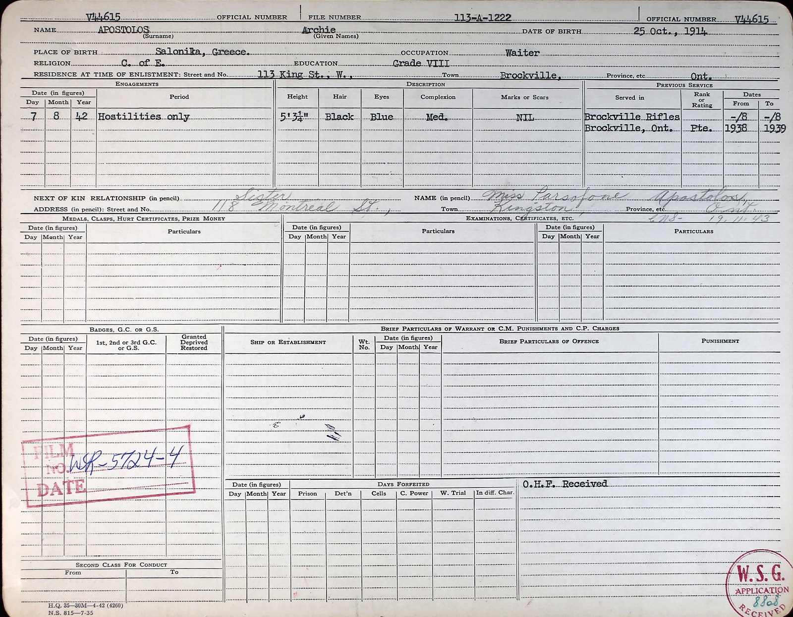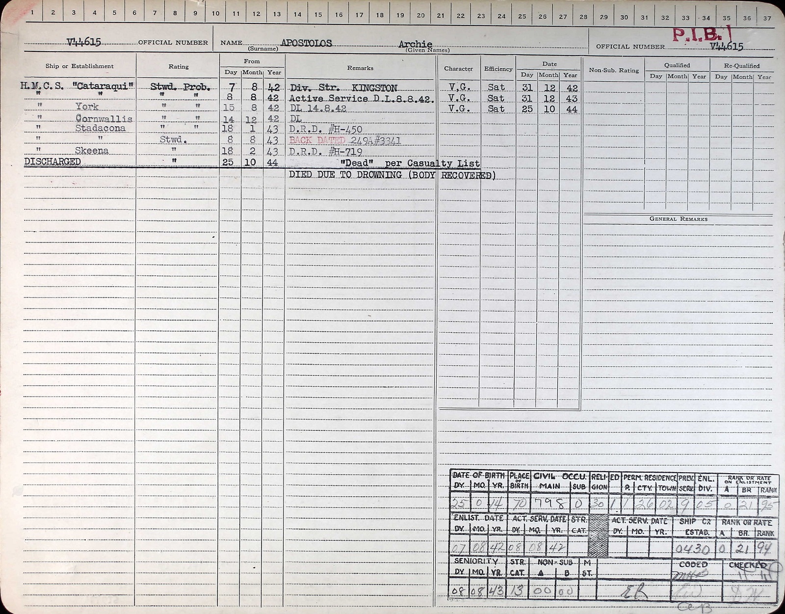 APOSTOLOS, Archie, Stwd, V44615, RCNVR, died - 25 Oct 1944, HMCS SKEENA - brother of Miss Parsofone Apostolos, Kingston, Ontario.