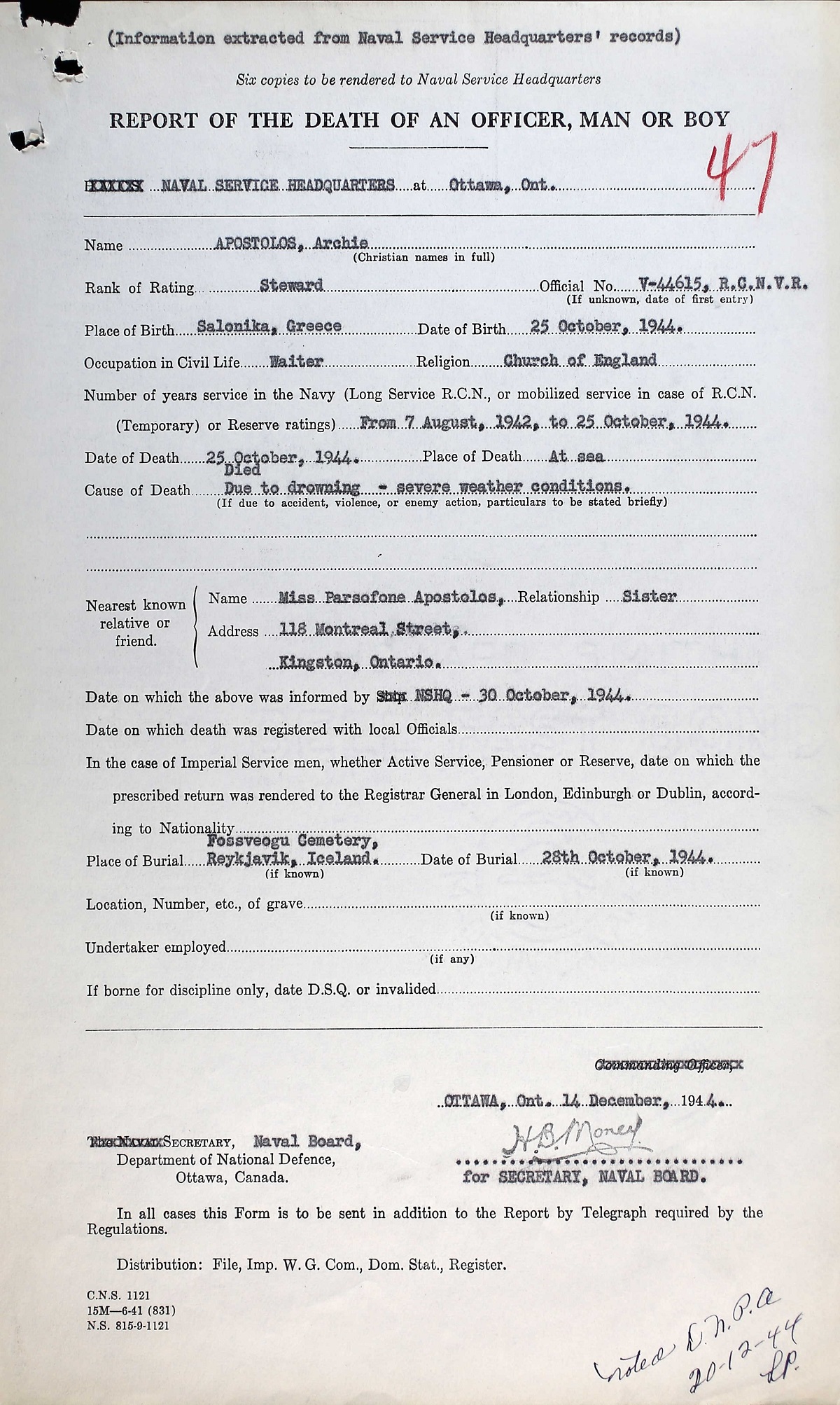 Steward Archie Apostolos died due to drowning when HMCS SKEENA was wrecked during a storm at Videy, Iceland. His body was recovered and identified near Reykavik Harbour, Iceland. He is buried in the Fossvogur Cemetery, Reykjavik, Iceland.