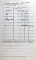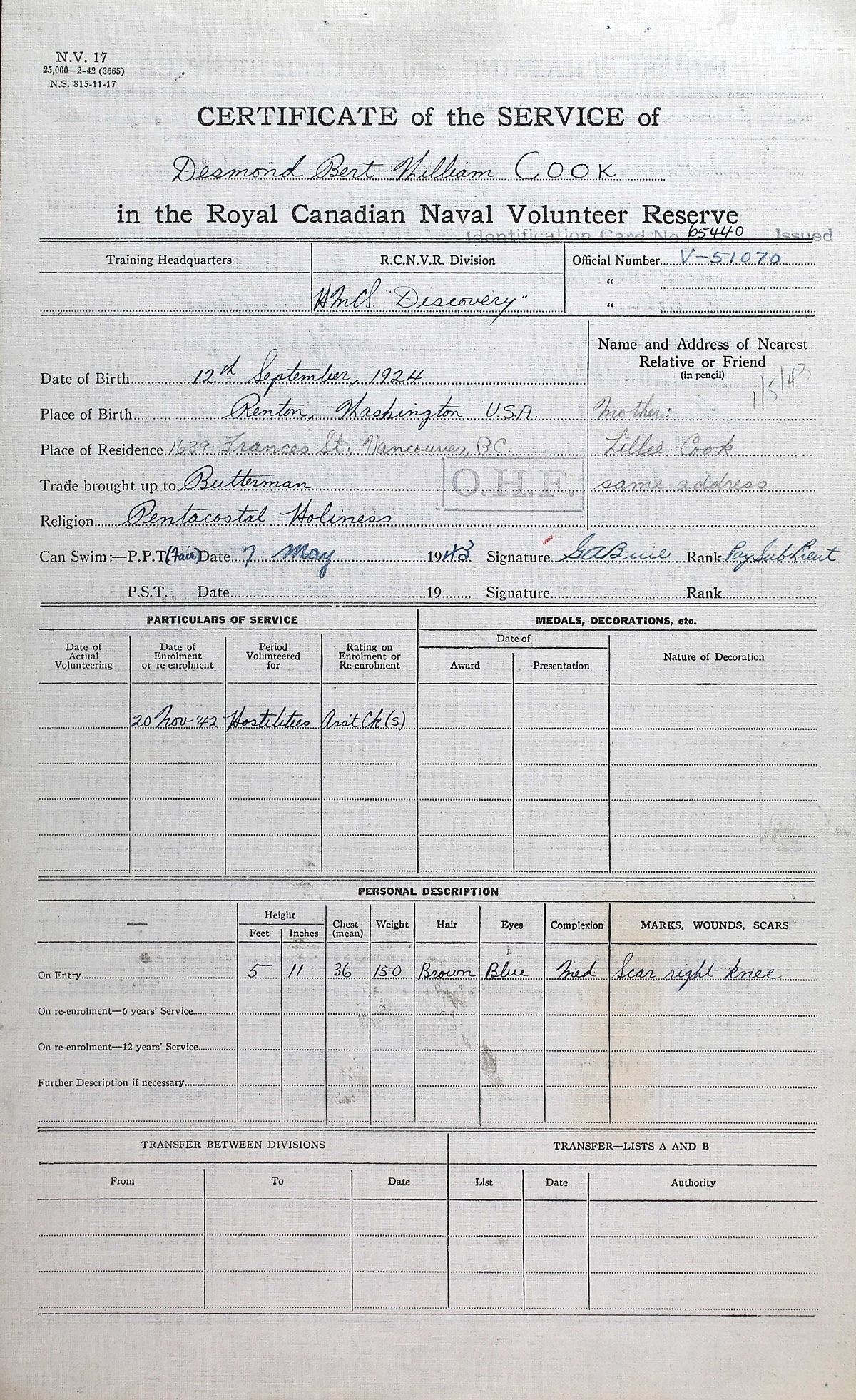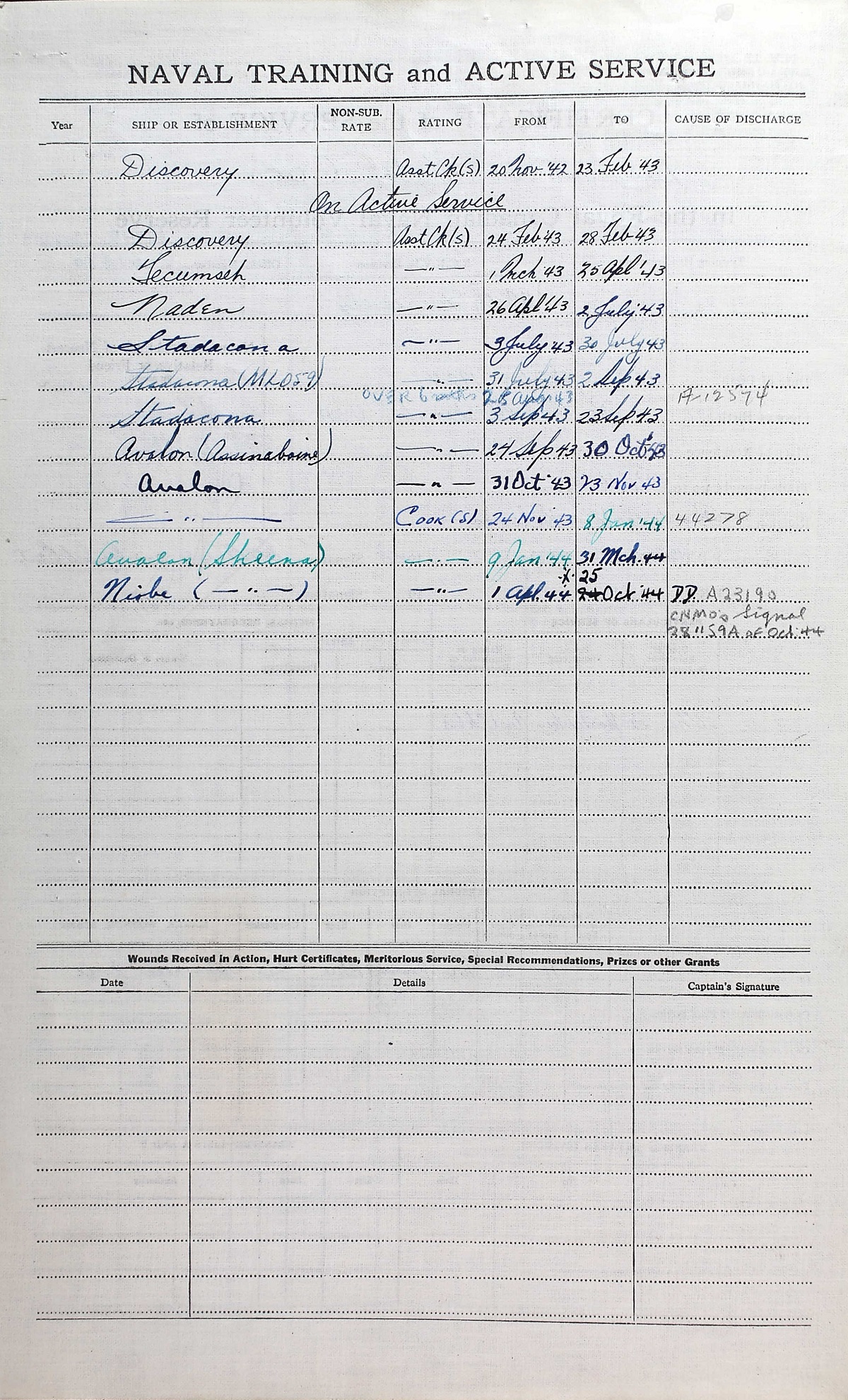 Ships served in: HMCS DISCOVERY - Enlisted 20 Nov 1945 as an Ass't Cook (S), RCNVR. Commenced Active Service 24 Feb 1943 HMCS TECUMSEH - Served in TECUMSEH 01 Mar 1943 - 25 Apr 1943 as an A/Ck(S), RCNVR HMCS NADEN - Drafted to NADEN 26 Apr 1943 as an A/Ck(S), RCNVR HMCS STADACONA - Drafted to STADACONA 03 Jul 1943 as an A/Ck(S), RCNVR ML Q059 - Served in Q059 31 Jul 1943 - 02 Sep 1943 as an A/Ck(S), RCNVR HMCS STADACONA - Drafted to STADACONA 03 Sep 1943 as an A/Ck(S), RCNVR HMCS ASSINIBOINE - Served in ASSINIBOINE 24 Sep 1943 - 30 Oct 1943 as an A/Ck(S), RCNVR HMCS AVALON - Drafted to AVALON 31 Oct 1943 as an A/Ck(S), RCNVR * Rated Cook (S) 24 Nov 1943 HMCS SKEENA - Drafted to SKEENA 09 Jan 1944 as a Ck(S), RCNVR