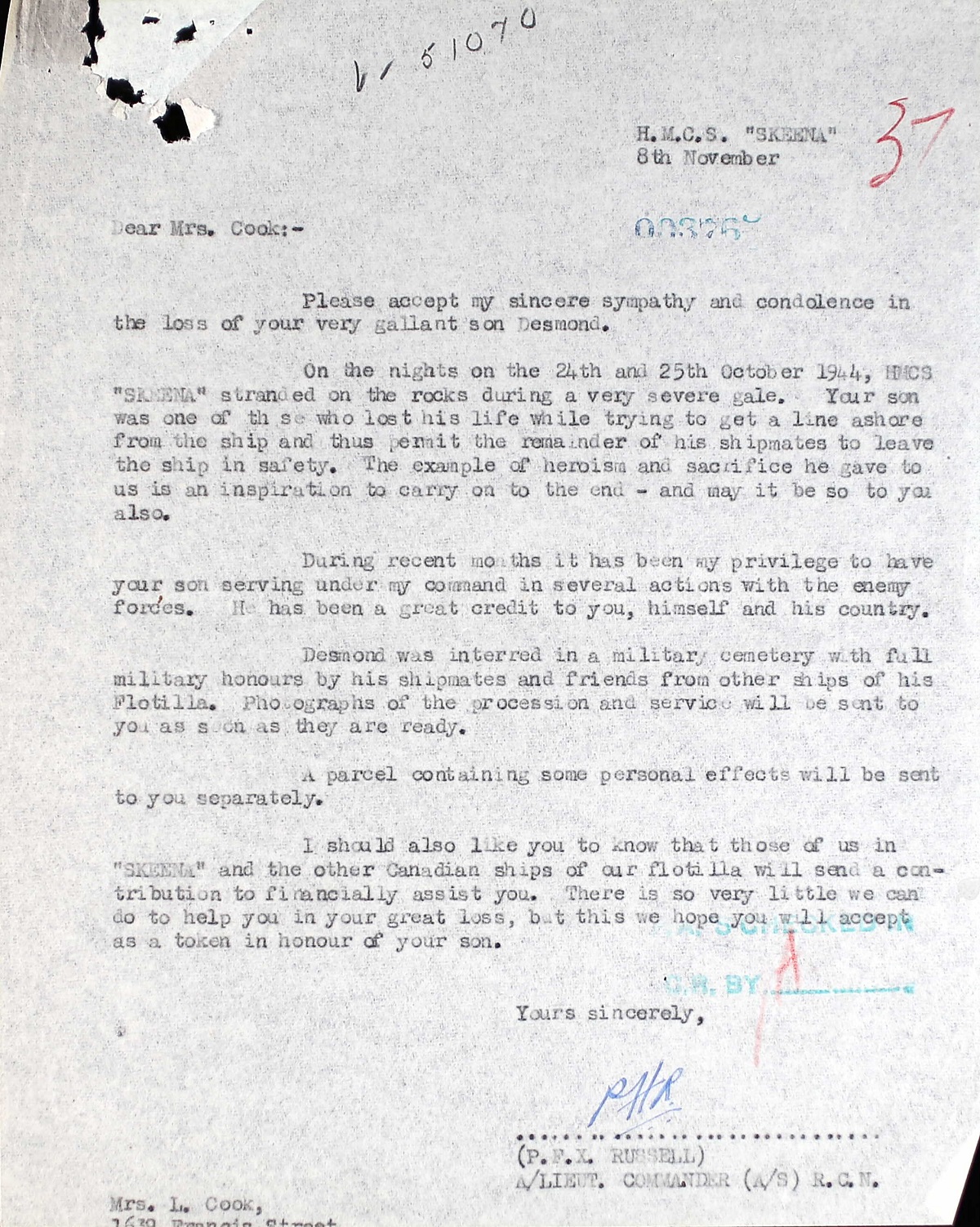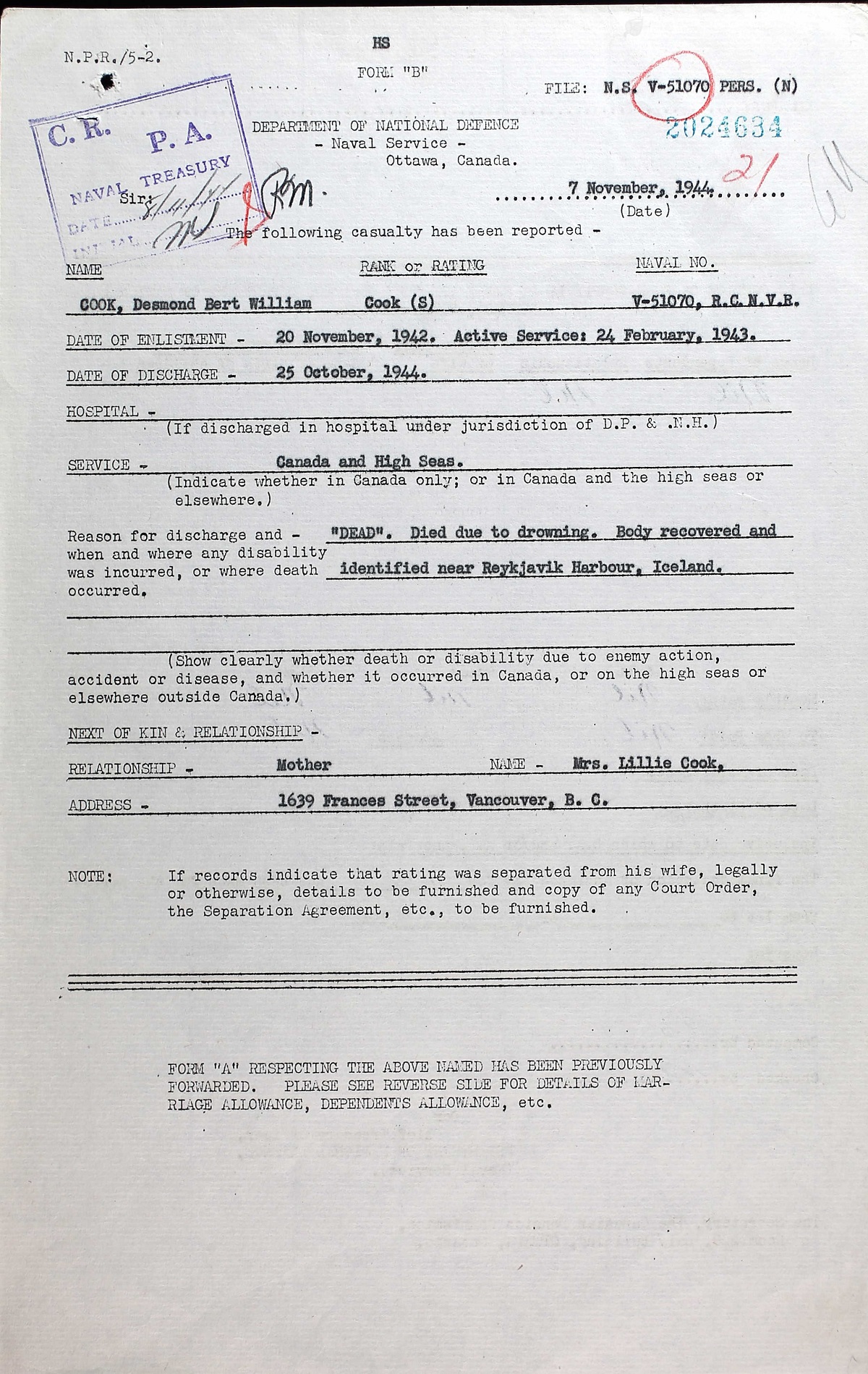 Cook (S) Desmond Cook drowned while trying to get a safety line ashore so that the remaining crew could be safely removed from SKEENA. His body later recovered near Reykjavik Harbour. He is buried in the Fossvogur Cemetery, Reykjavik, Iceland. Prior to enlisting in the Navy he was employed by Fraser Valley Milk Producers. Besides his parents, he is survived by two sisters, Elaine and Mrs. E. Kosh.