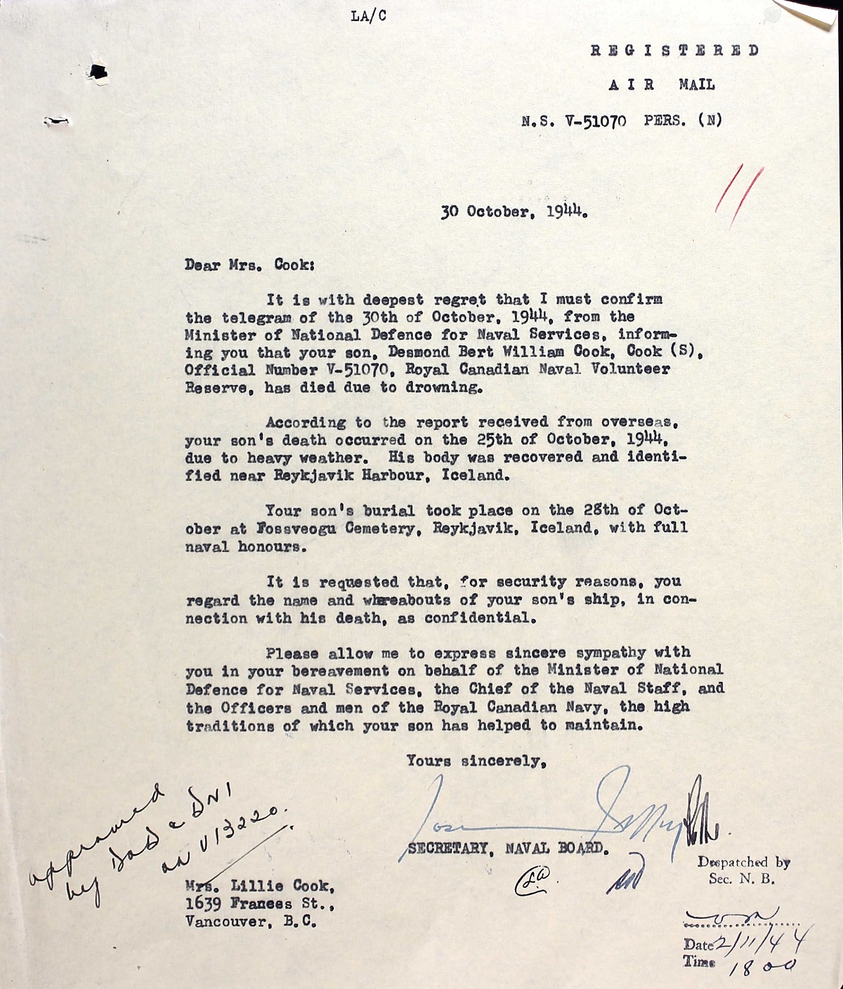 COOK, Desmond Bert William, Cook (S), V51070, RCNVR, died - 25 Oct 1944, HMCS SKEENA - Son of Bert and Lillie Cook, Vancouver, BC.
