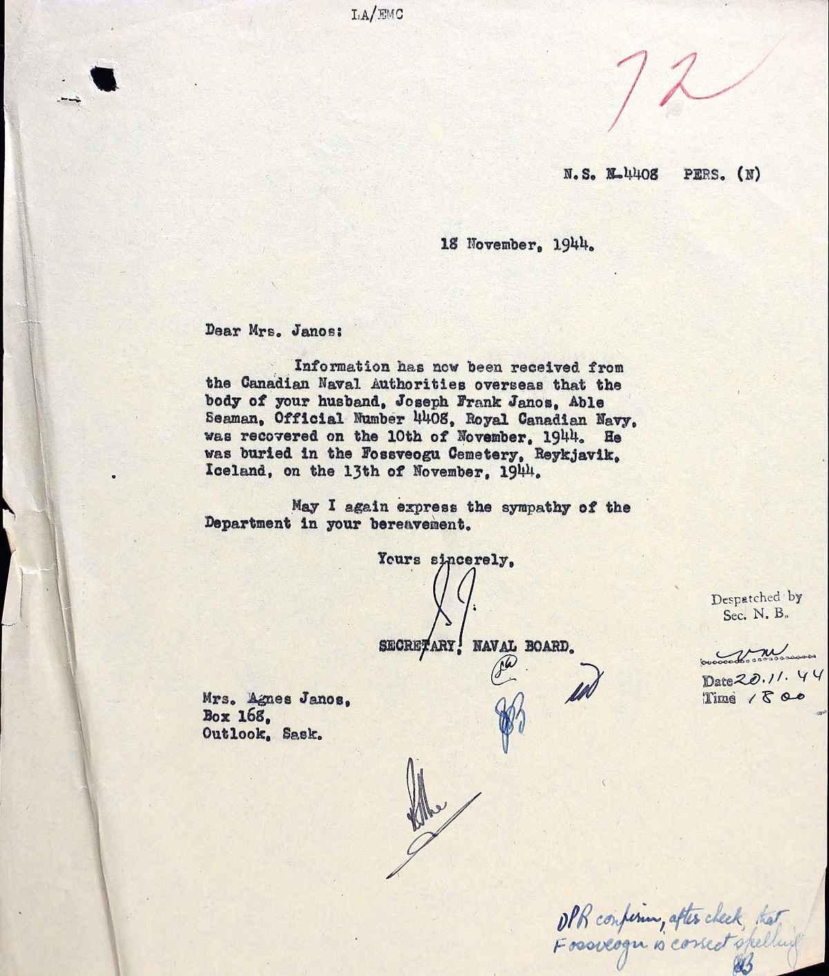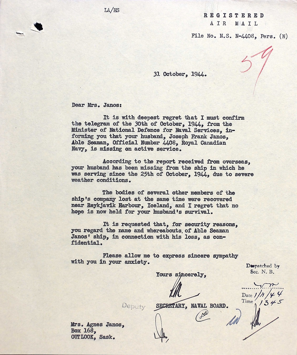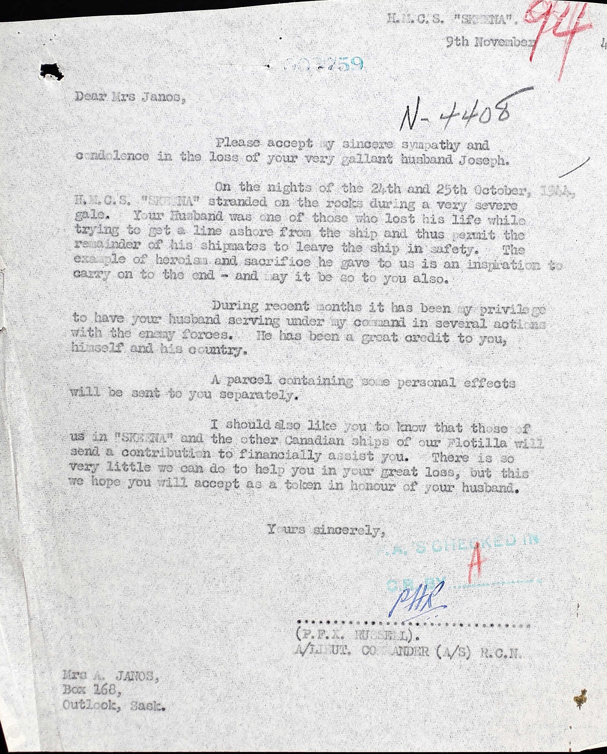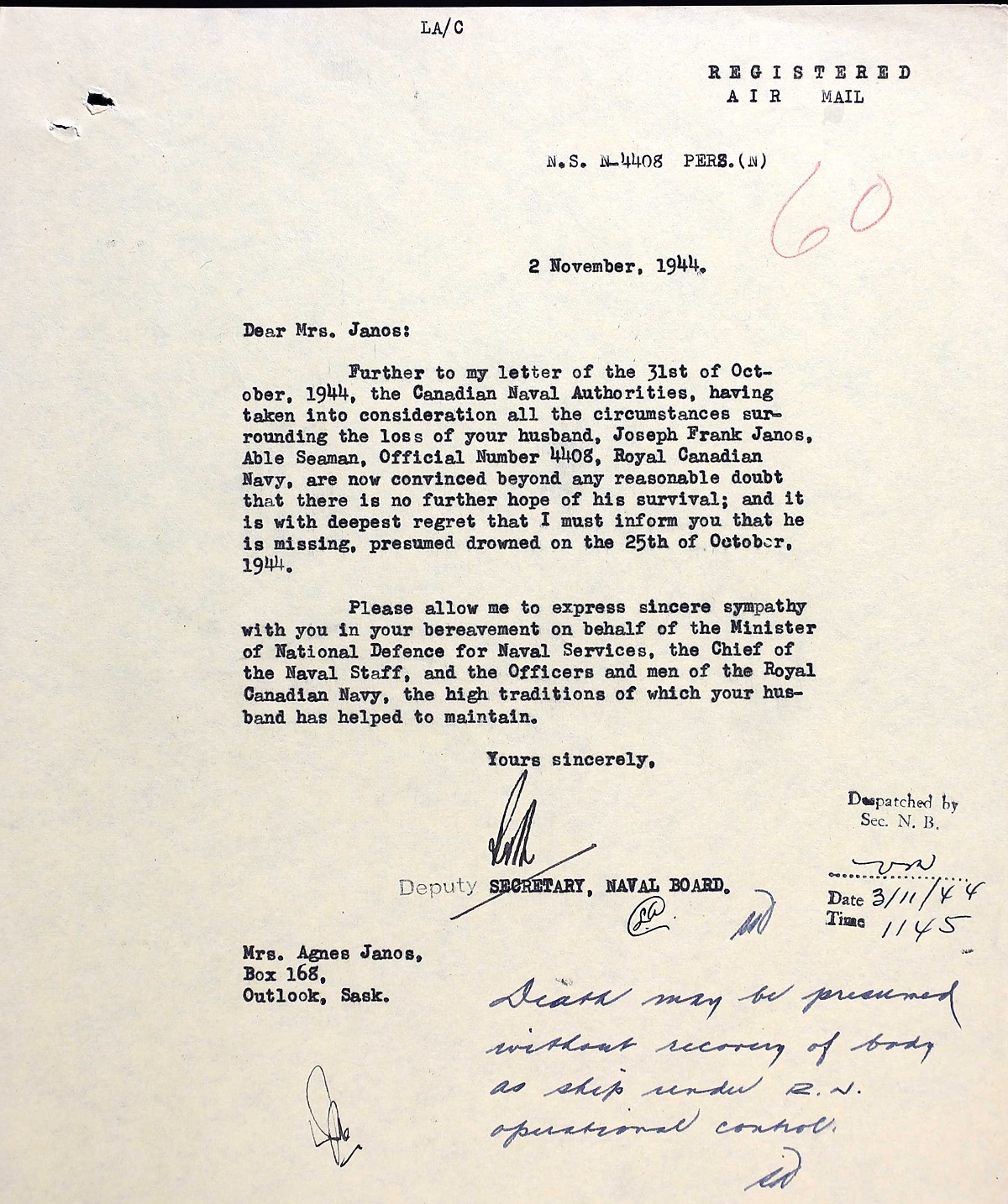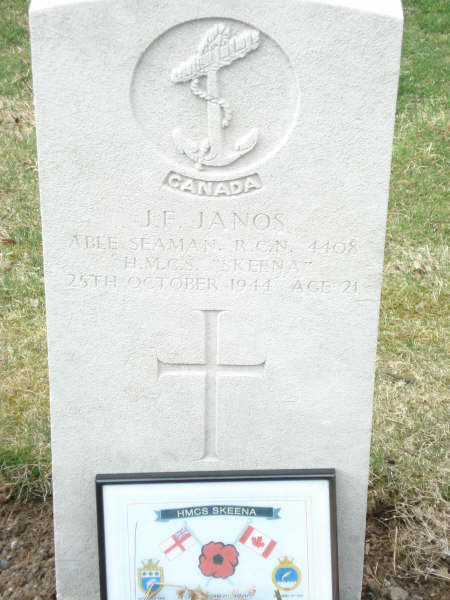 JANOS, Joseph Frank, AB, 4408, RCN, killed - 25 Oct 1944, HMCS SKEENA - Son of Francis Janos of Canmore, Alberta. Husband of Agnes Janos.