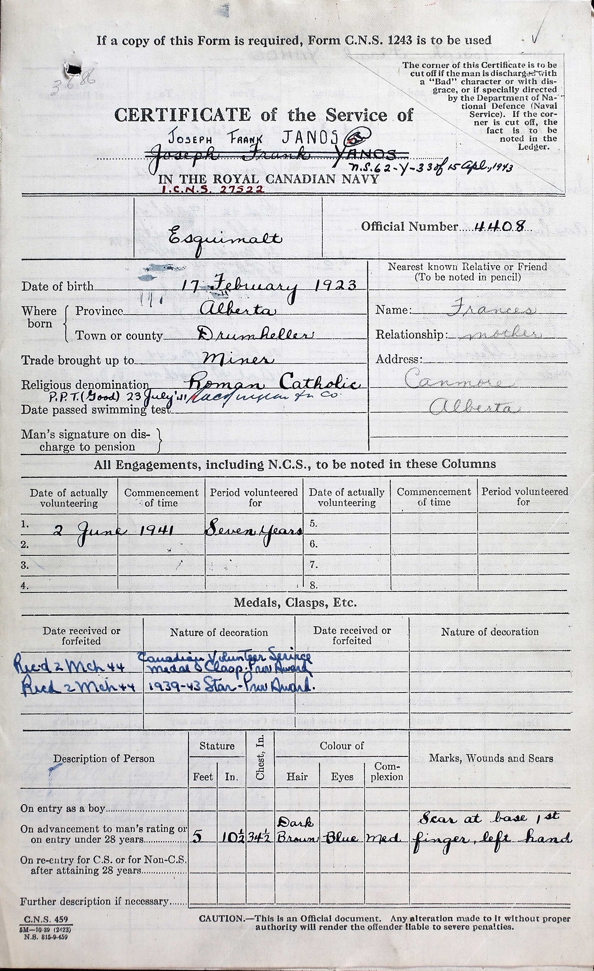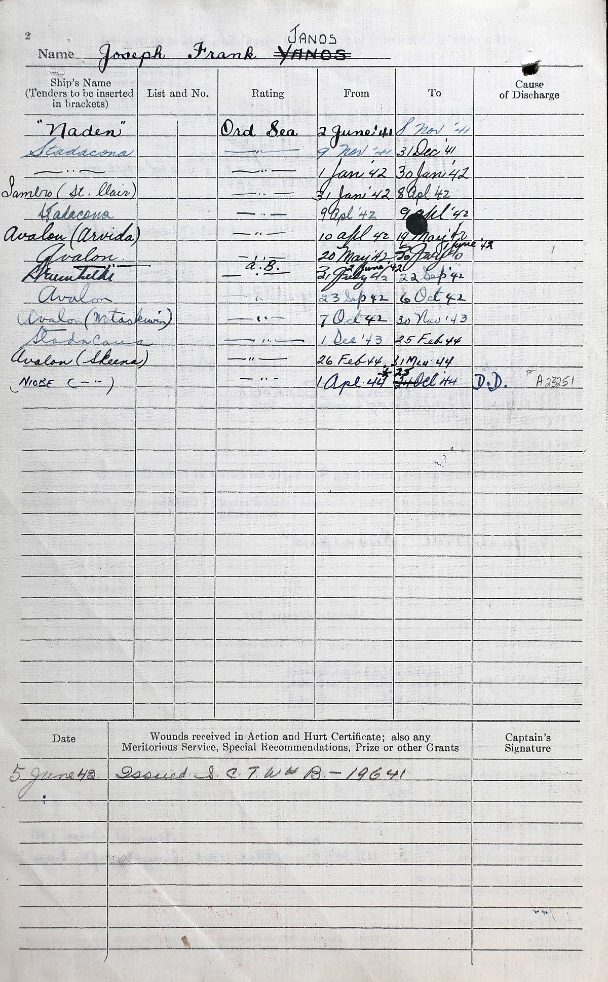 Ships served in: HMCS NADEN - Enlisted 02 Jun 1941 as an OS, RCN HMCS STADACONA - Drafted to STADACONA 09 Nov 1941 as an OS, RCN * Rated A/S.T. 21 Jan 1942 HMCS ST CLAIR - Served in ST CLAIR 31 Jan 1942 - 08 Apr 1942 as an OS, RCN HMCS STADACONA - Drafted to STADACONA 09 Apr 1942 as an OS, RCN HMCS ARVIDA - Served in ARVIDA 10 Apr 1942 - 19 May 1942 as an OS, RCN HMCS AVALON - Drafted to AVALON 20 May 1942 as an OS, RCN * Rated AB 02 Jun 1942 HMCS DRUMHELLER - Served in DRUMHELLER 31 Jul 1942 - 22 Sep 1942 as an AB, RCN HMCS AVALON - Drafted to AVALON 23 Sep 1942 as an AB, RCN HMCS WETASKIWIN - Serve in WETASKIWIN 07 Oct 1942 - 30 Nov 1943 as an AB, RCN HMCS STADACONA - Drafted to STADACONA 01 Dec 1943 as an AB, RCN HMCS SKEENA - Drafted to SKEENA 26 Feb 1944 as an AB, RCN