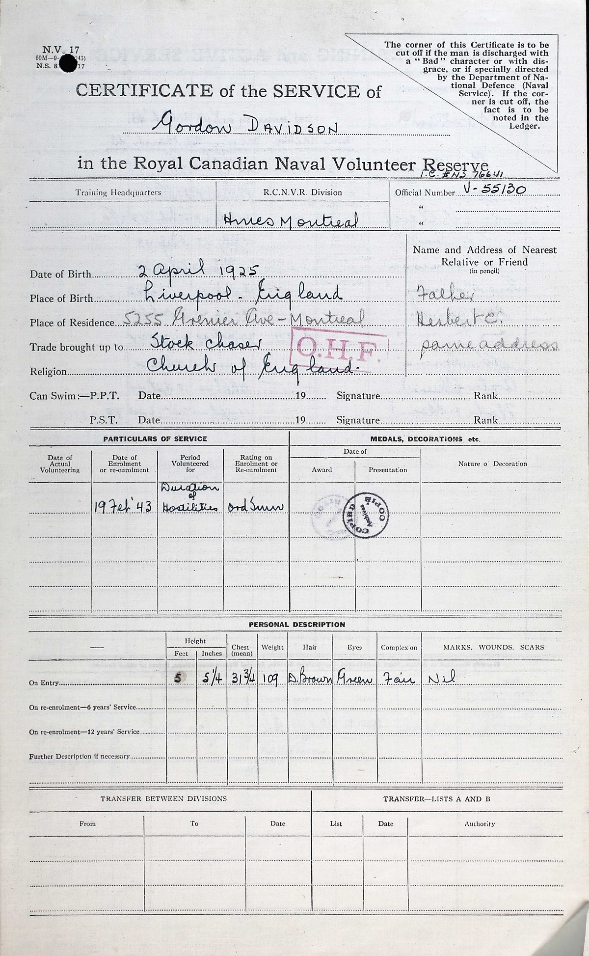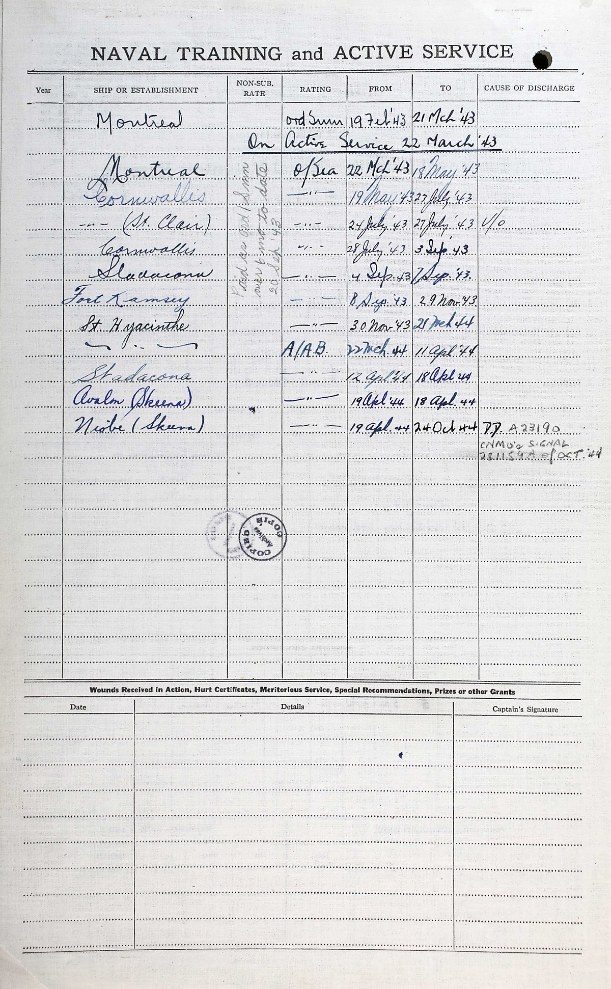 Ships served in: HMCS MONTREAL - Enlisted 19 Feb 1943. Commenced Active Service 22 Mar 1943 HMCS CORNWALLIS - Drafted to CORNWALLIS 19 May 1943 as an OS, RCNVR HMCS STADACONA - Drafted to STADACONA 04 Sep 1943 as an OS, RCNVR HMCS FORT RAMSAY - Drafted to FORT RAMSAY 08 Sep 1943 as an OS, RCNVR HMCS ST HYACINTHE - Drafted to ST HYACINTHE 23 Nov 1943 as an OS, RCNVR. Rated A/AB 11 Apr 1944 HMCS STADACONA - Drafted to STADACONA 13 Apr 1944 as an A/AB, RCNVR HMCS SKEENA - Drafted to SKEENA 25 Oct 1944 as an A/AB, RCNVR