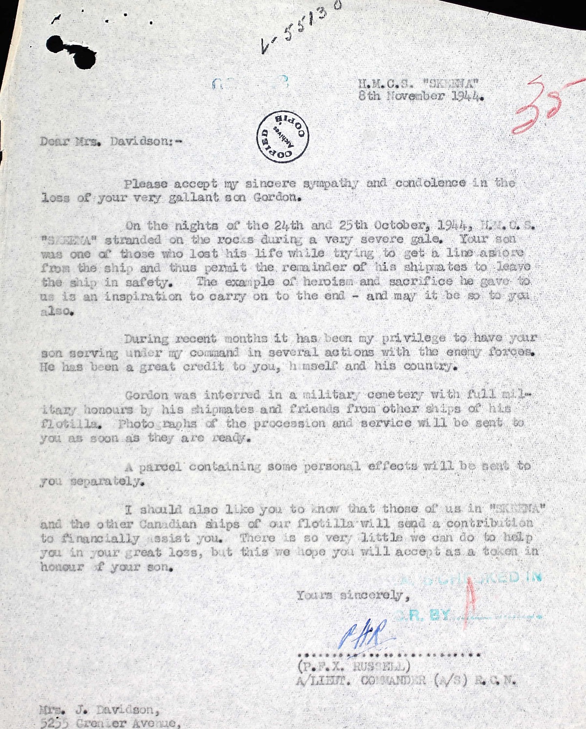 DAVIDSON, Gordon, AB, V55130, RCNVR, died - 25 Oct 1944, HMCS SKEENA - Son of Herbert C. and Janet C. Davidson of Montreal, Quebec.
