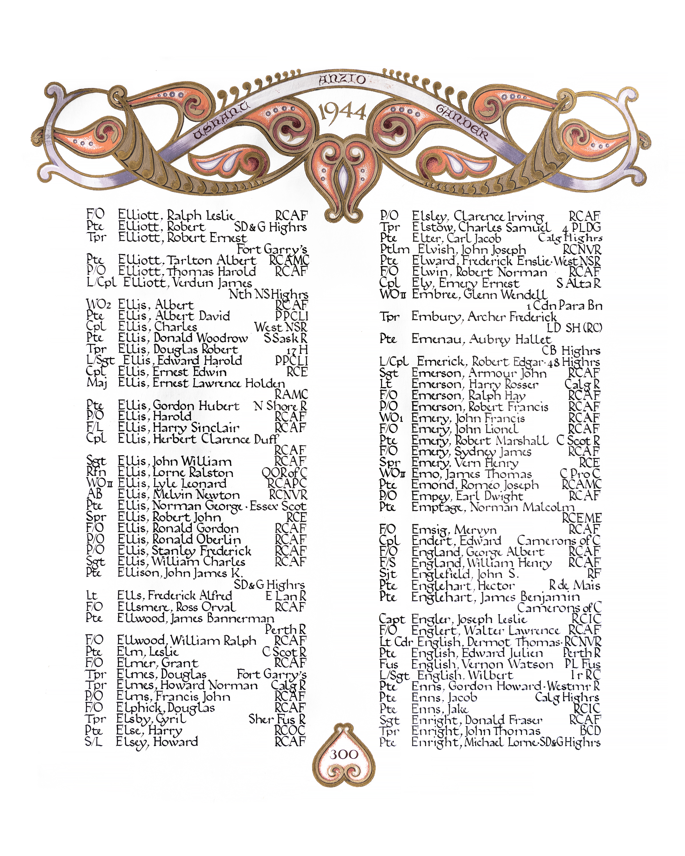 Ships served in: HMCS BRUNSWICKER - Enlisted 13 Nov 1942 * Commenced Active Service 31 Dec 1943 as an Ordinary Seaman, RCNVR HMCS CORNWALLIS - Drafted to CORNWALLIS 02 Mar 1943 HMCS STADACONA - Drafted to STADACONA 01 Jun 1943 * Rated Probationary Seaman Torpedoman, RCNVR 21 Jun 1943 HMCS SKEENA - Drafted to SKEENA 15 Jul 194 * Rated Seaman Torpedoman, RCNVR 13 Nov 1943 * Rated AB 31 Dec 1943