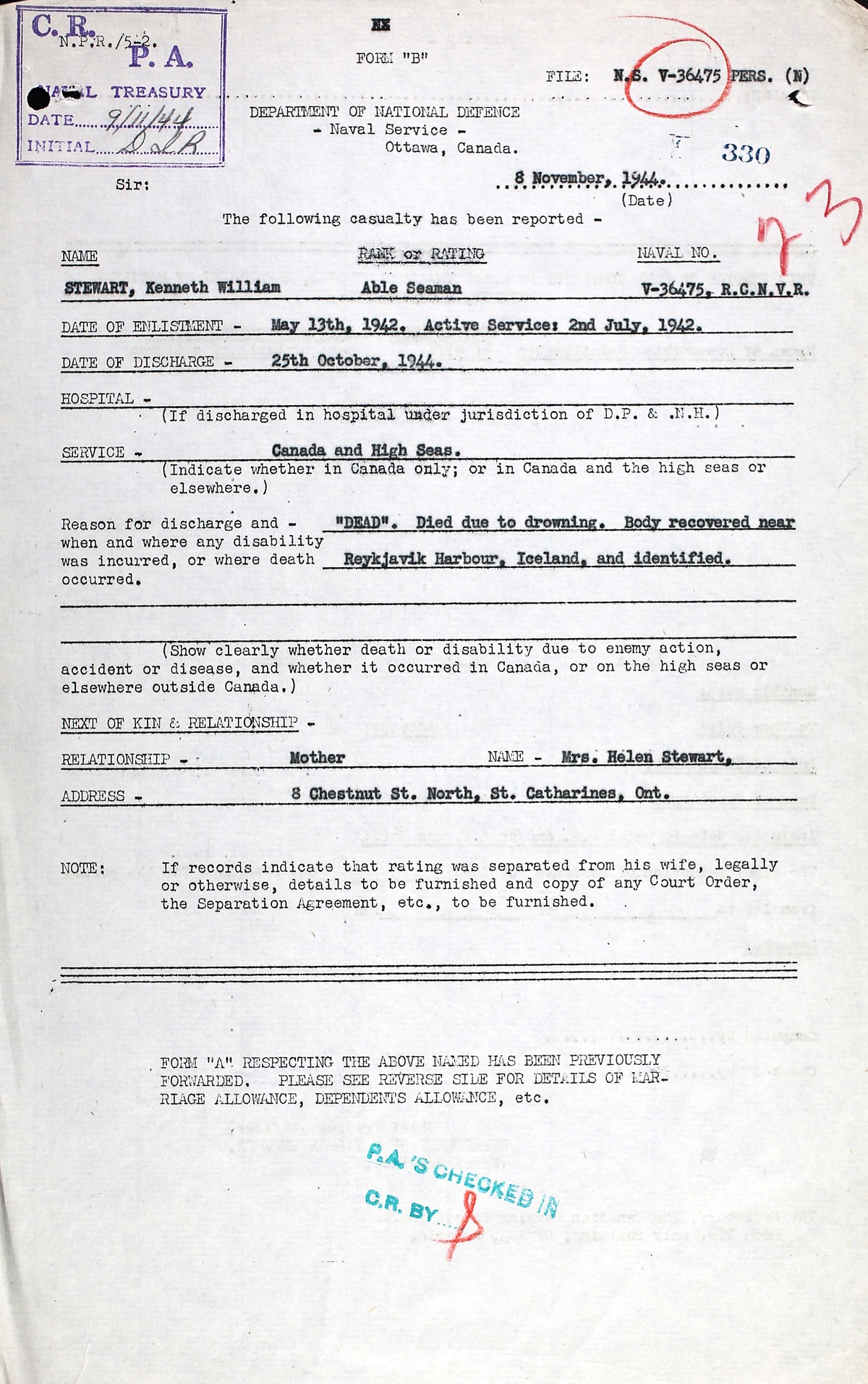 AB Stewart drowned while trying to get a safety line ashore so that the remaining crew could be safely removed from SKEENA. His body later recovered near Reykjavik Harbour. He is buried in the Fossvogur Cemetery, Reykjavik, Iceland. Before he enlisted in the Navy he worked as a labourer at a Paper Mill.