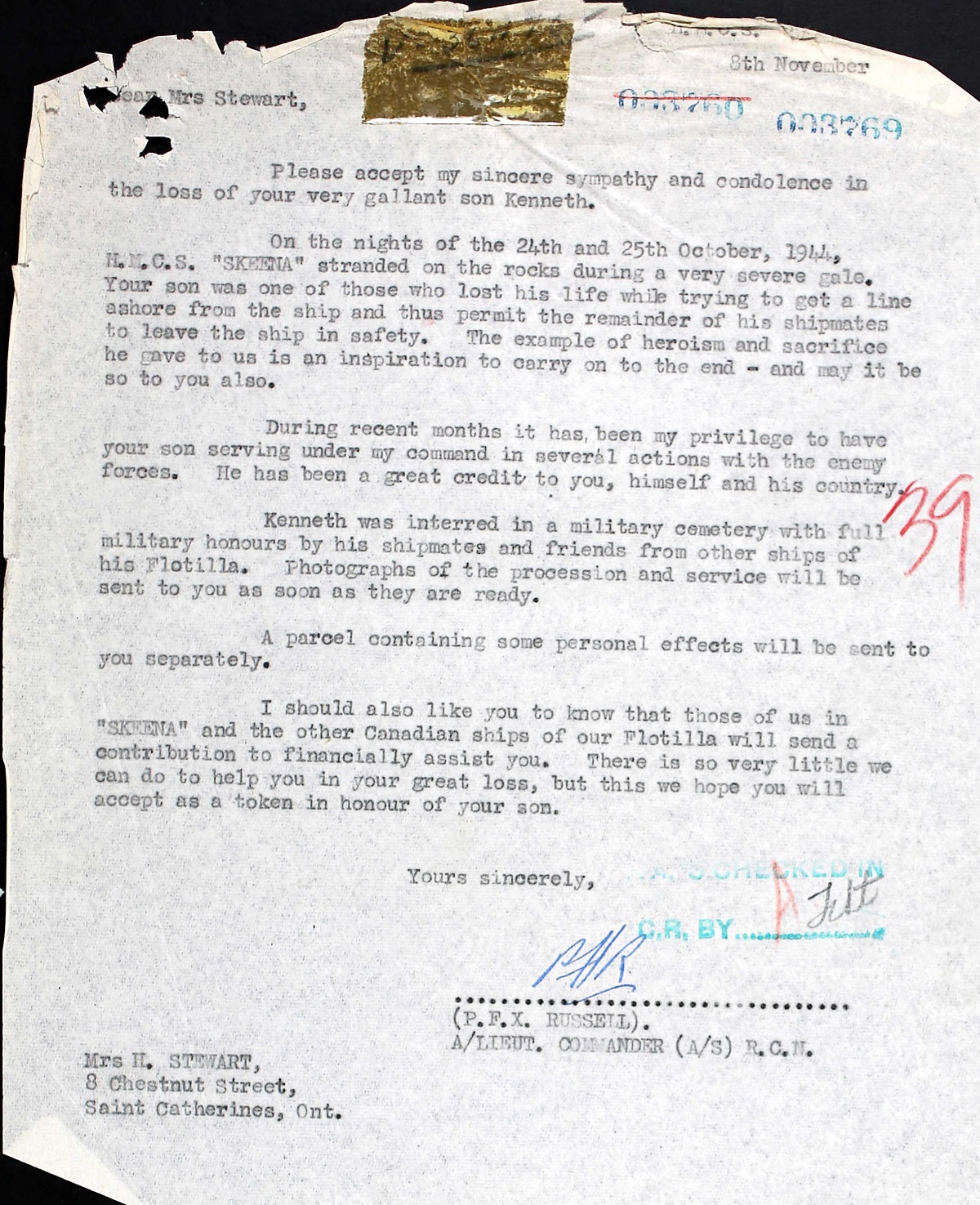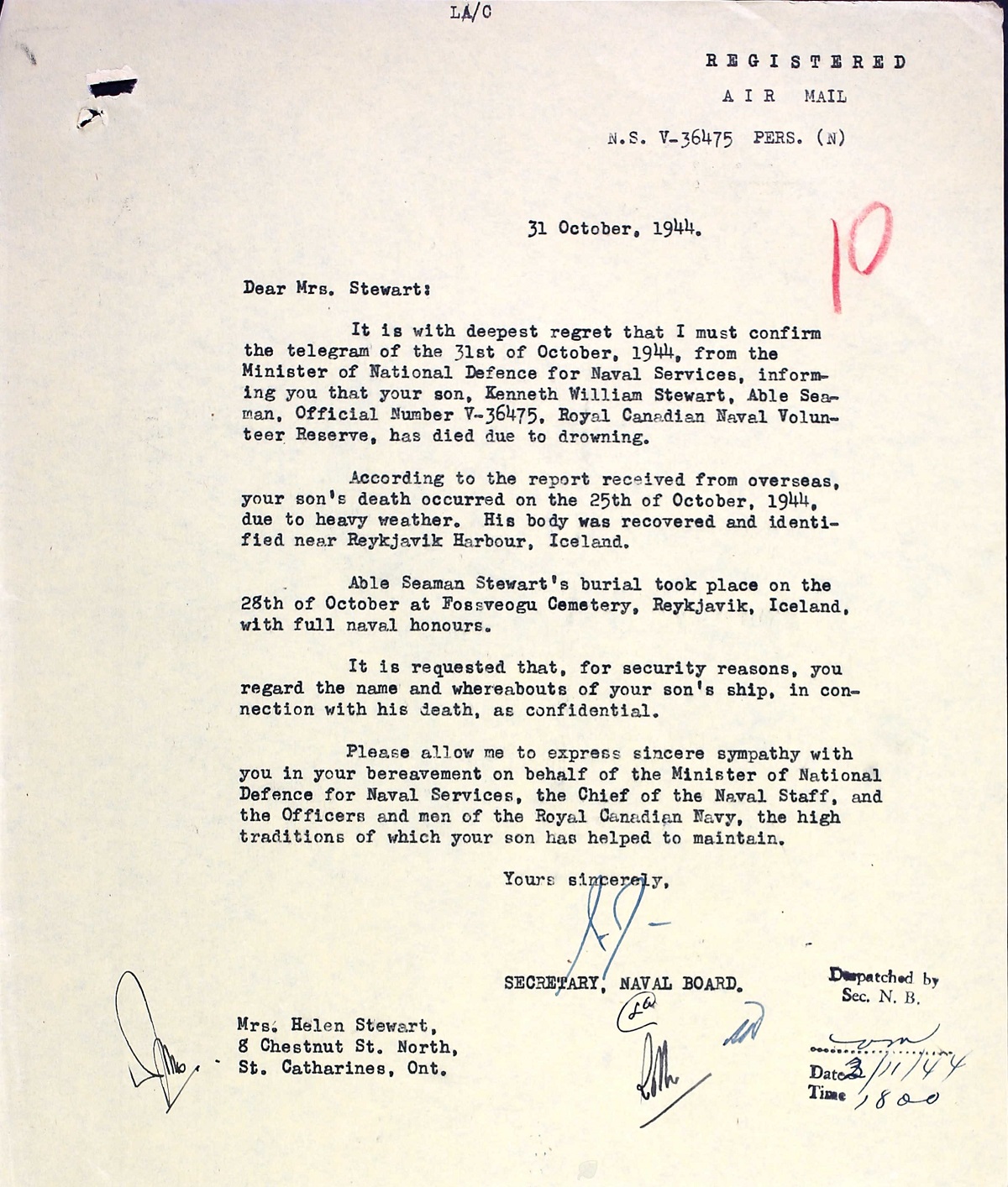 STEWART, Kenneth William, AB, V36475, RCNVR, killed - 25 Oct 1944, HMCS SKEENA - Son of George L. and Helen Stewart, St. Catharines, Ontario.