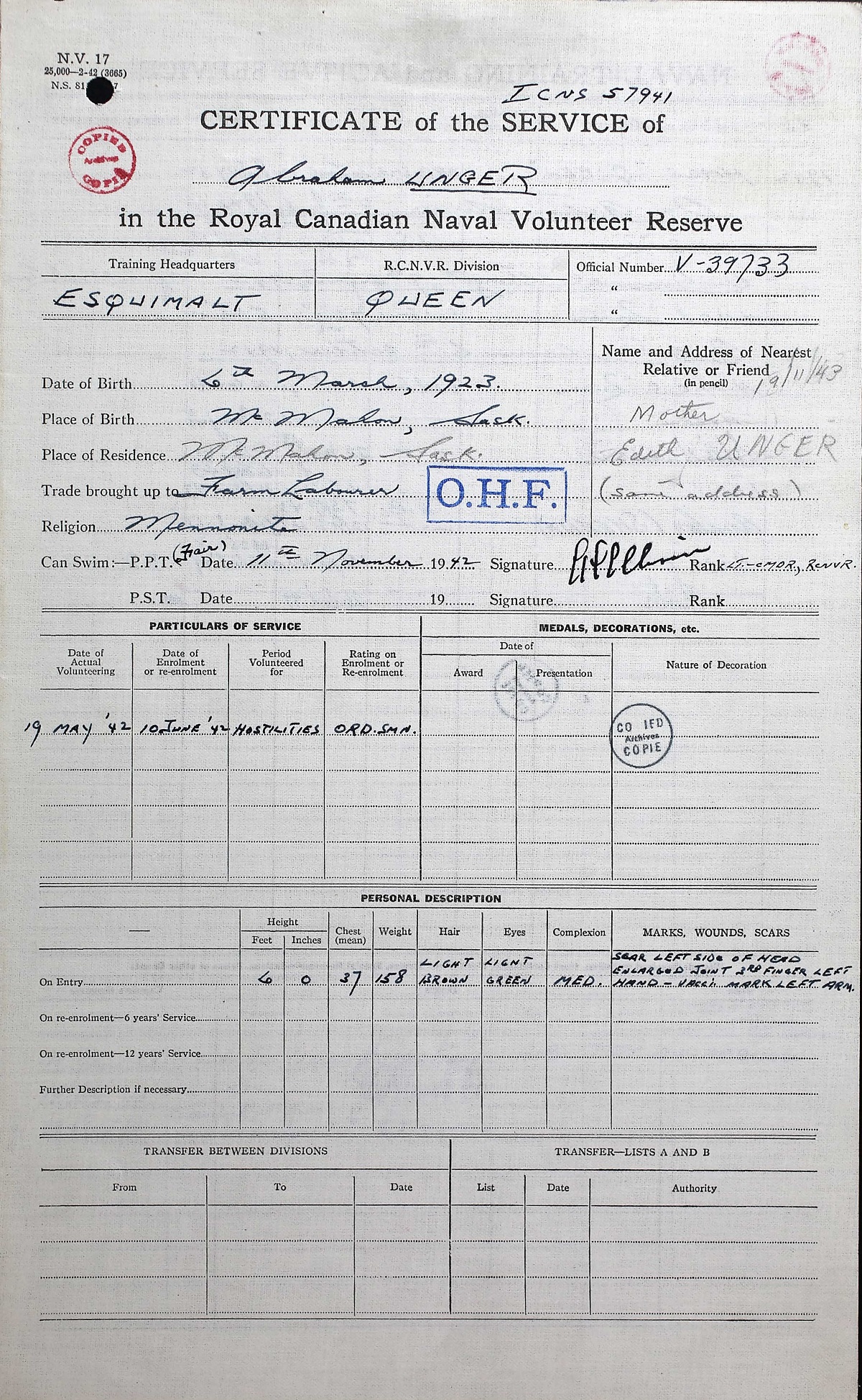 Ships served in: HMCS QUEEN - Enlisted 10 Jun 1942. Commenced Active Service 09 Jul 1942 HMCS QUEEN (on Divisional Strength - 07 Aug 1942 - 05 Oct 19542 for Agricultural Leave. Returned to Active Service 06 Oct 1942 HMCS NADEN - Drafted to NADEN 11 Jan 1943 as an OS, RCNVR HMCS STADACONA - Drafted to STADACONA 22 Mar 1943 as an OS, RCNVR HMCS AVALON - Drafted to AVALON 16 Aug 1943 as an OS, RCNVR * Rated AB 07 Sep 1943 HMCS SKEENA - Drafted to SKEENA 12 Oct 1943 as an AB, RCNVR