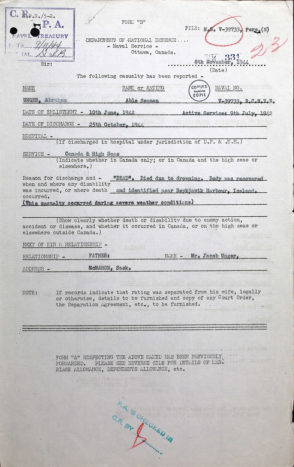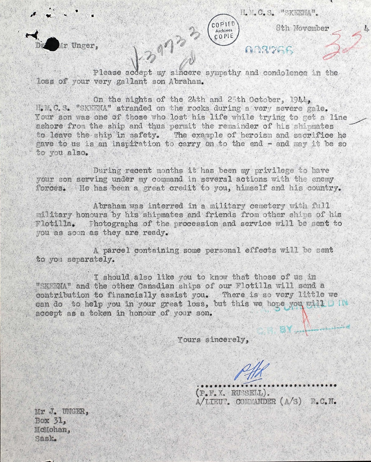 UNGER, Abraham, AB, V39733, RCNVR, died - 25 Oct 1944, HMCS SKEENA - Son of Jacob J. and Judith Unger, of McMahon, Saskatchewan.