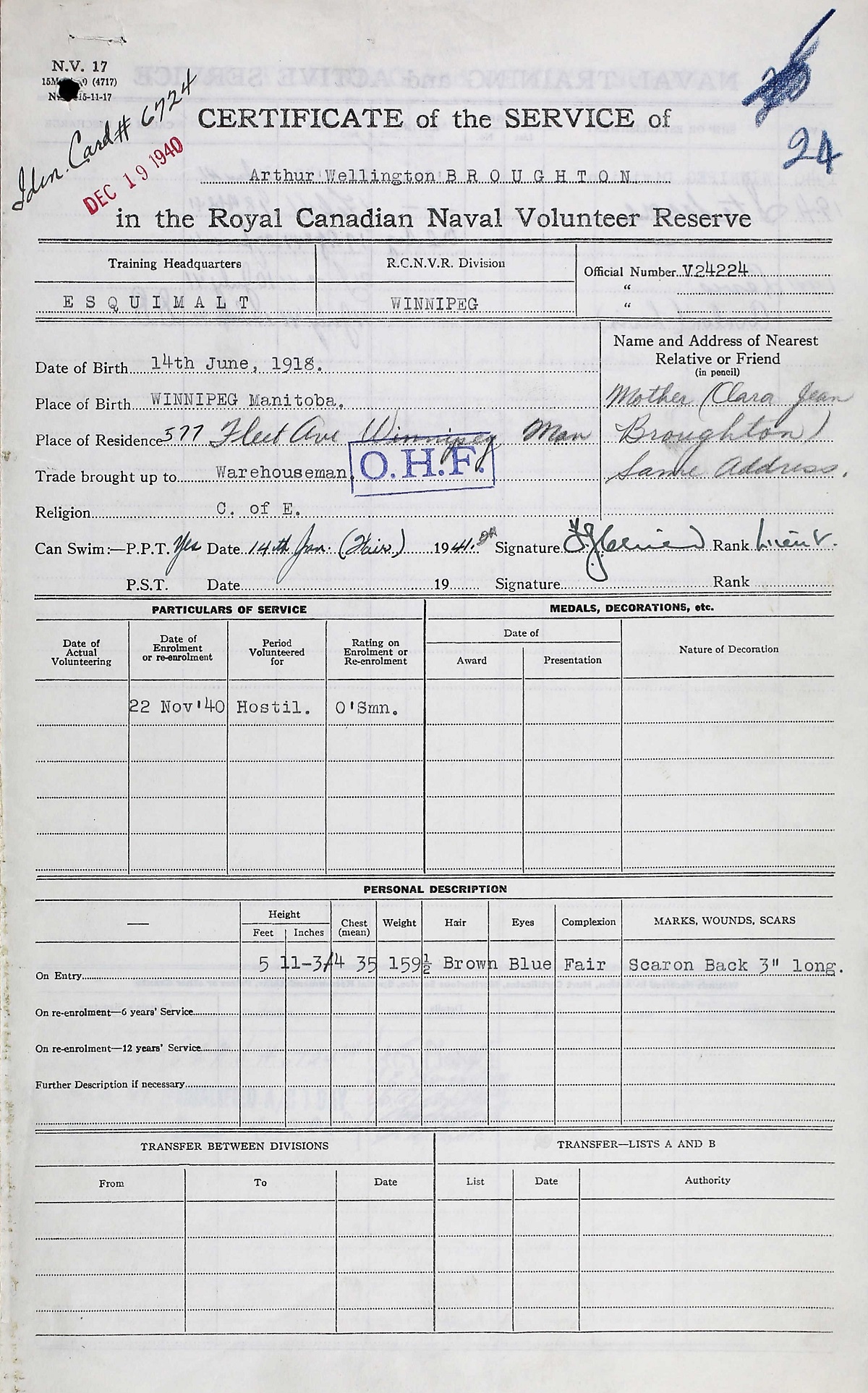 BROUGHTON, Arthur Wellington, O/Sig, V24224, RCNVR, MPK - 19 Sep 1941, HMCS LEVIS - Son of Joseph W.A. and Clara Jean Broughton, Winnipeg, Manitoba.