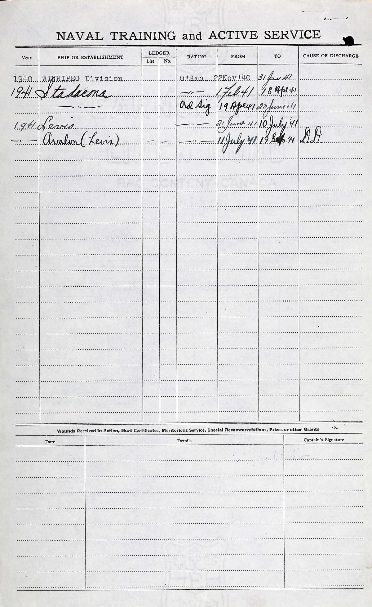 Ships served in: WINNIPEG DIVISION RCNVR - Enlisted 22 Nov 1940. Commenced Active Service 16 Dec 1940 HMCS STADACONA - Drafted to STADACONA 01 Feb 1941 as an OS, RCNVR * Rated O/Sig 19 Apr 1941 HMCS LEVIS - drafted to LEVIS 21 Jun 1941 as an O/Sig, RCNVR