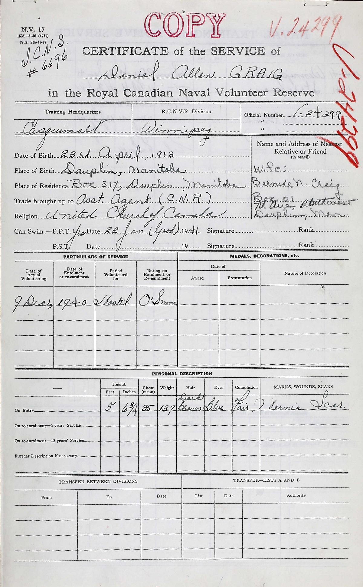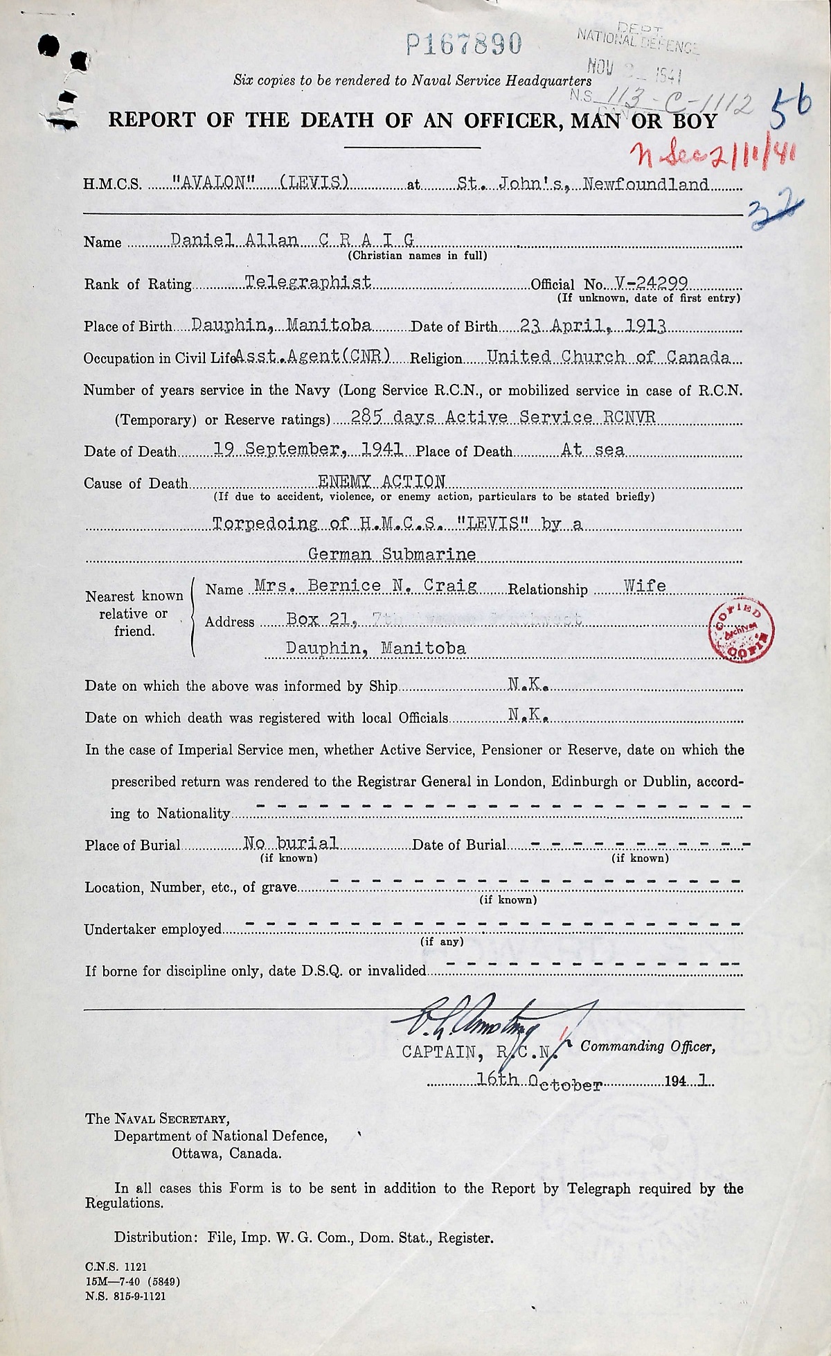 CRAIG, Daniel Allan, Tel, V24299, RCNVR, MPK - 19 Sep 1941, HMCS LEVIS - son of Mr. and Mrs. Daniel Allen Craig, Dauphin, MB; husband of Lance Corporal Vernice Noreen Craig, Dauphin, MB.