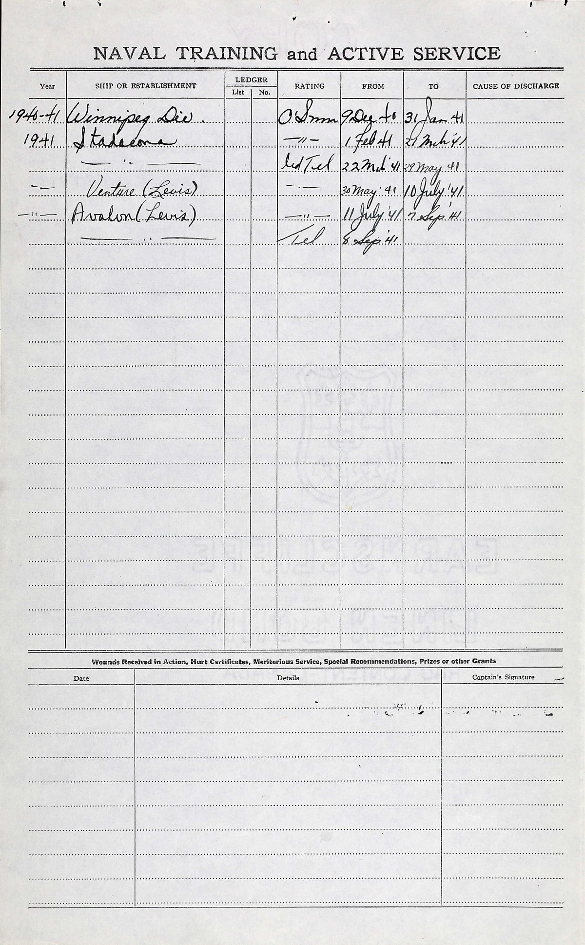 Ships served in: WINNIPEG DIVISION RCNVR - Enlisted 04 Dec 1940. Commenced Active Service 09 Sep 1940 HMCS STADACONA - Drafted to STADACONA 01 Feb 1941 as an OS, RCNVR * Rated O/Tel 22 Mar 1941 * Rated Tel 17 May 1941 HMCS LEVIS - Drafted to LEVIS 30 May 1941 as a Tel, RCNVR