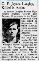 JAYNES, George Earl, Sto 1c, 21786, RCN, MPK - 19 Sep 1941, HMCS LEVIS - Son of George Earl and Margaret Eliza Jaynes, of Ladner, British Columbia.