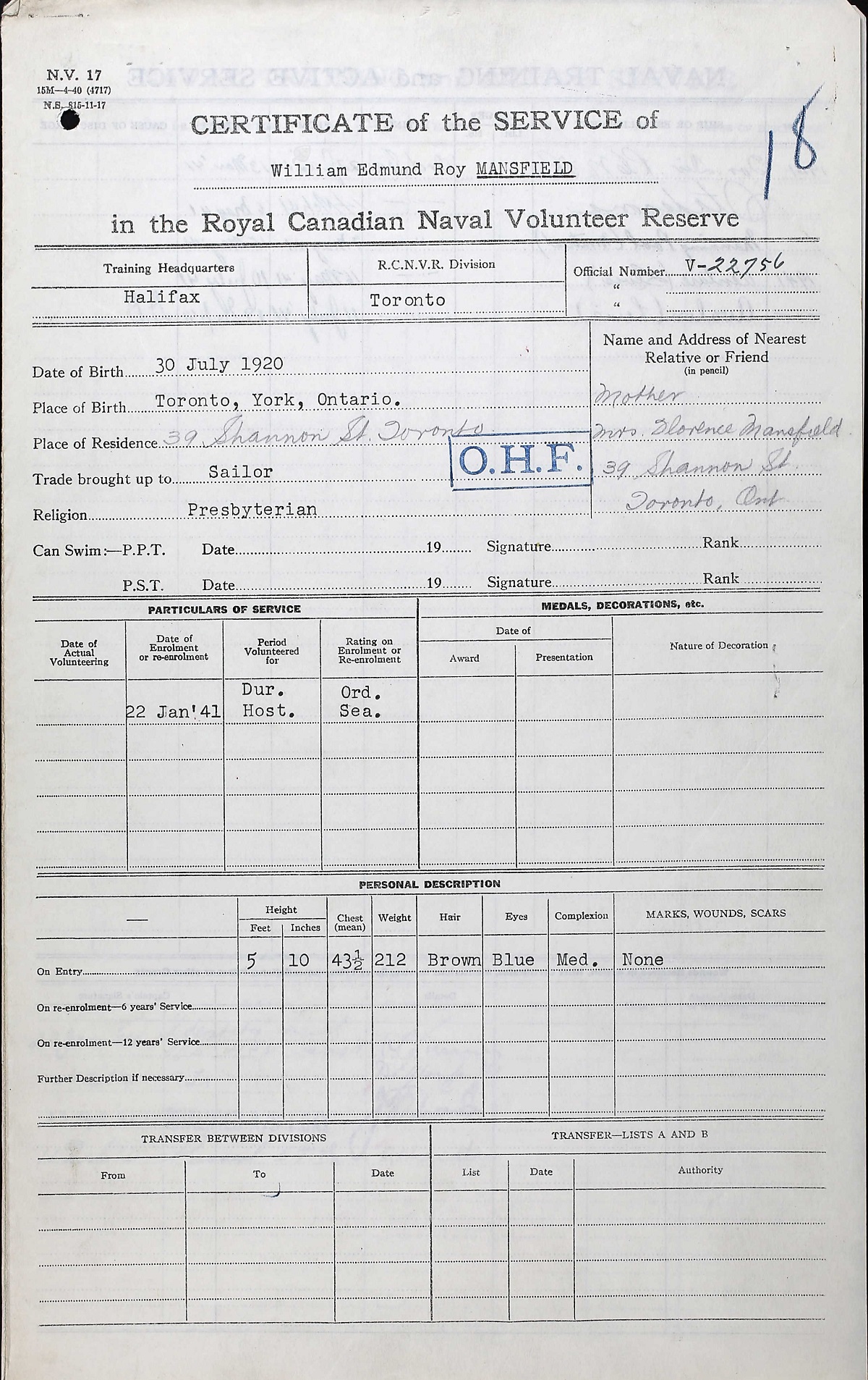 OS Mansfield lost his life when HMCS LEVIS was torpedoed and sunk. Prior to enlisting he was a seaman for McColl Frontenac Oil Co. Ltd, Yardley House, Toronto, Ontario.