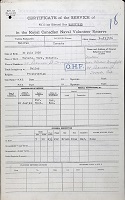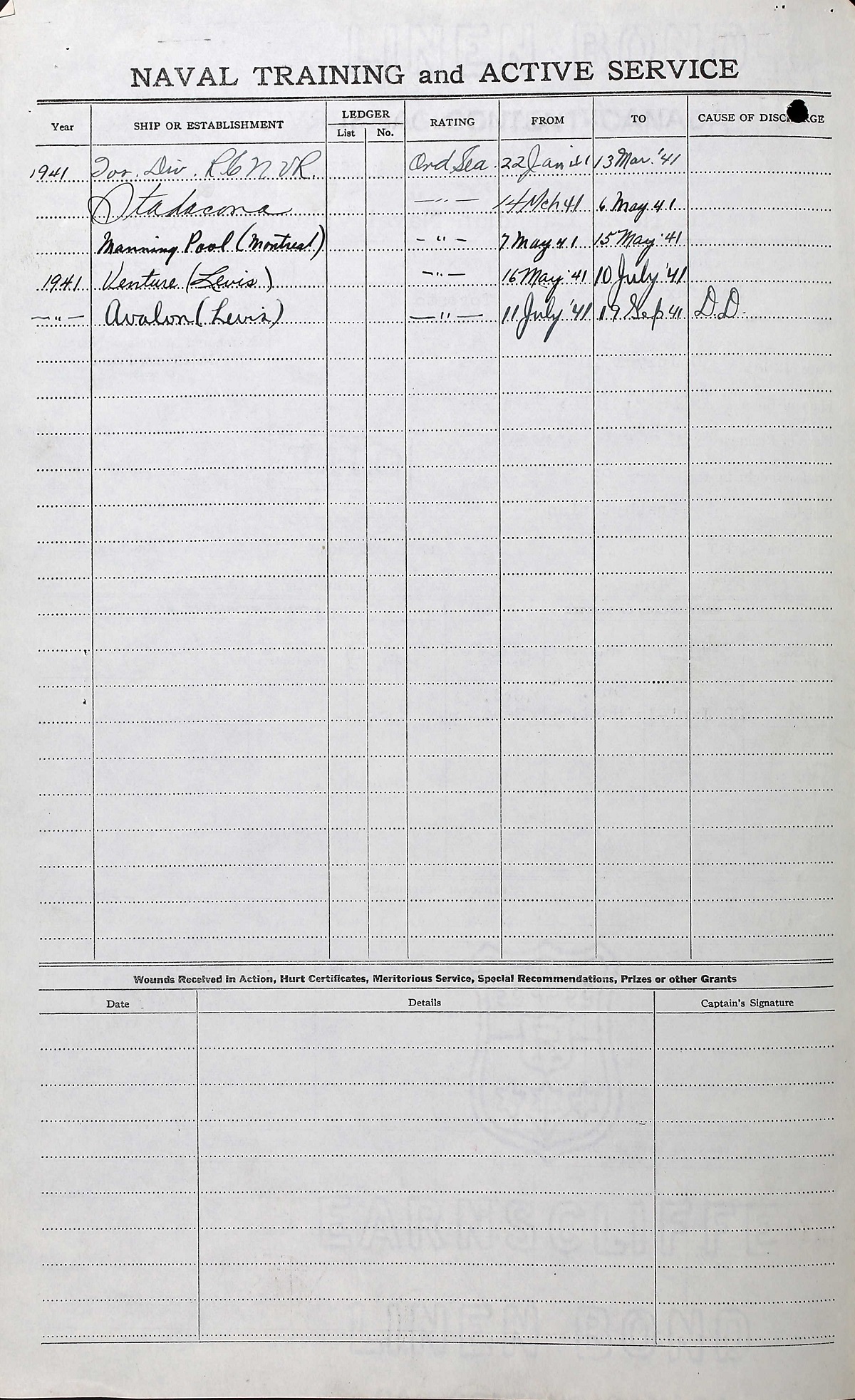 Ships served in: TORONTO DIVISION RCNVR - Enlisted 22 Jan 1941. Commenced Active Service 23 Jan 1941 as an OS, RCNVR HMCS STADACONA - Drafted to STADACONA 14 Mar 1941 as an OS, RCNVR HMCS HOCHELAGA - Drafted to HOCHELAGA (Manning Pool) 07 May 1941 as an OS, RCNVR HMCS LEVIS - Drafted to LEVIS 16 May 1941 as an OS, RCNVR