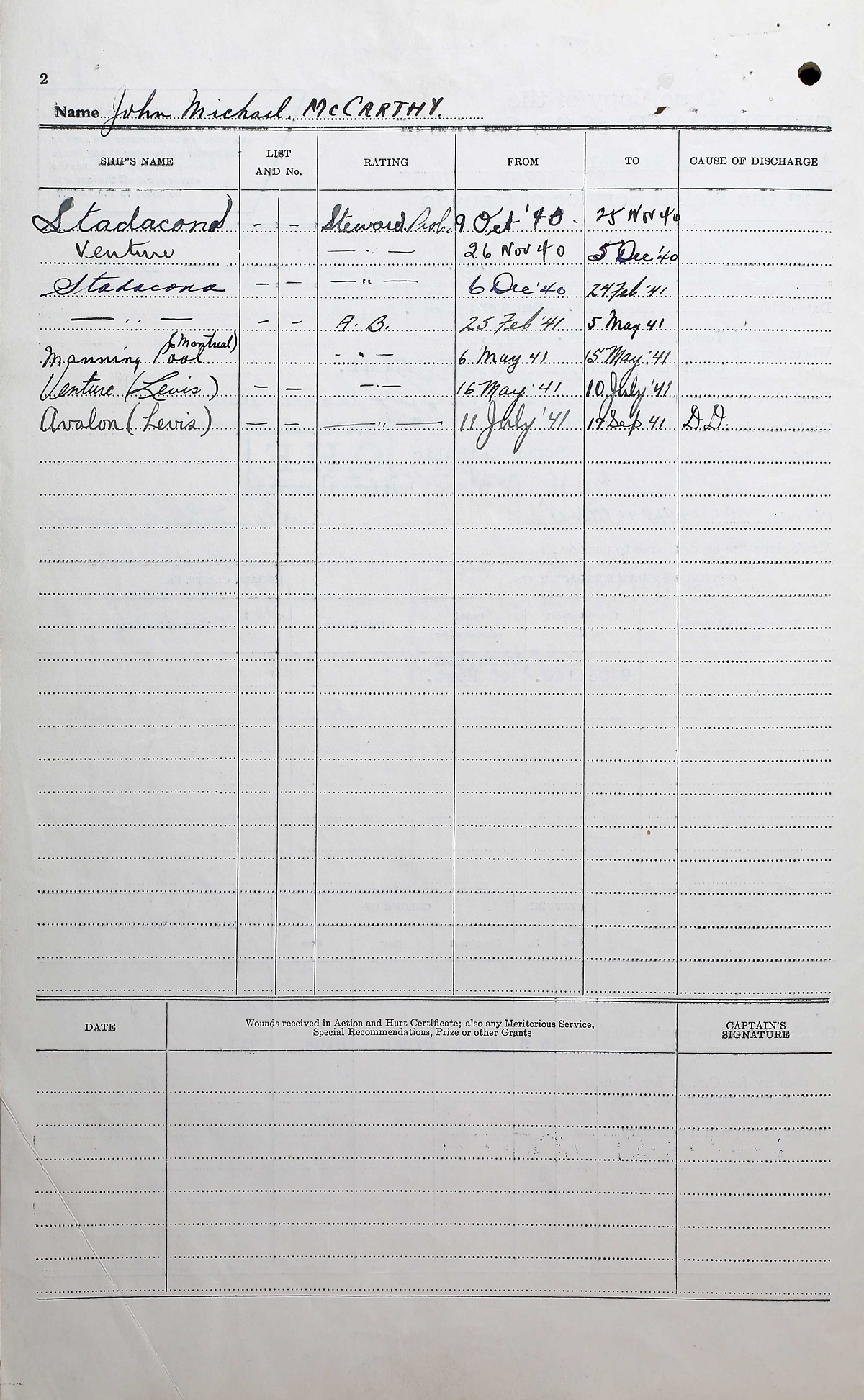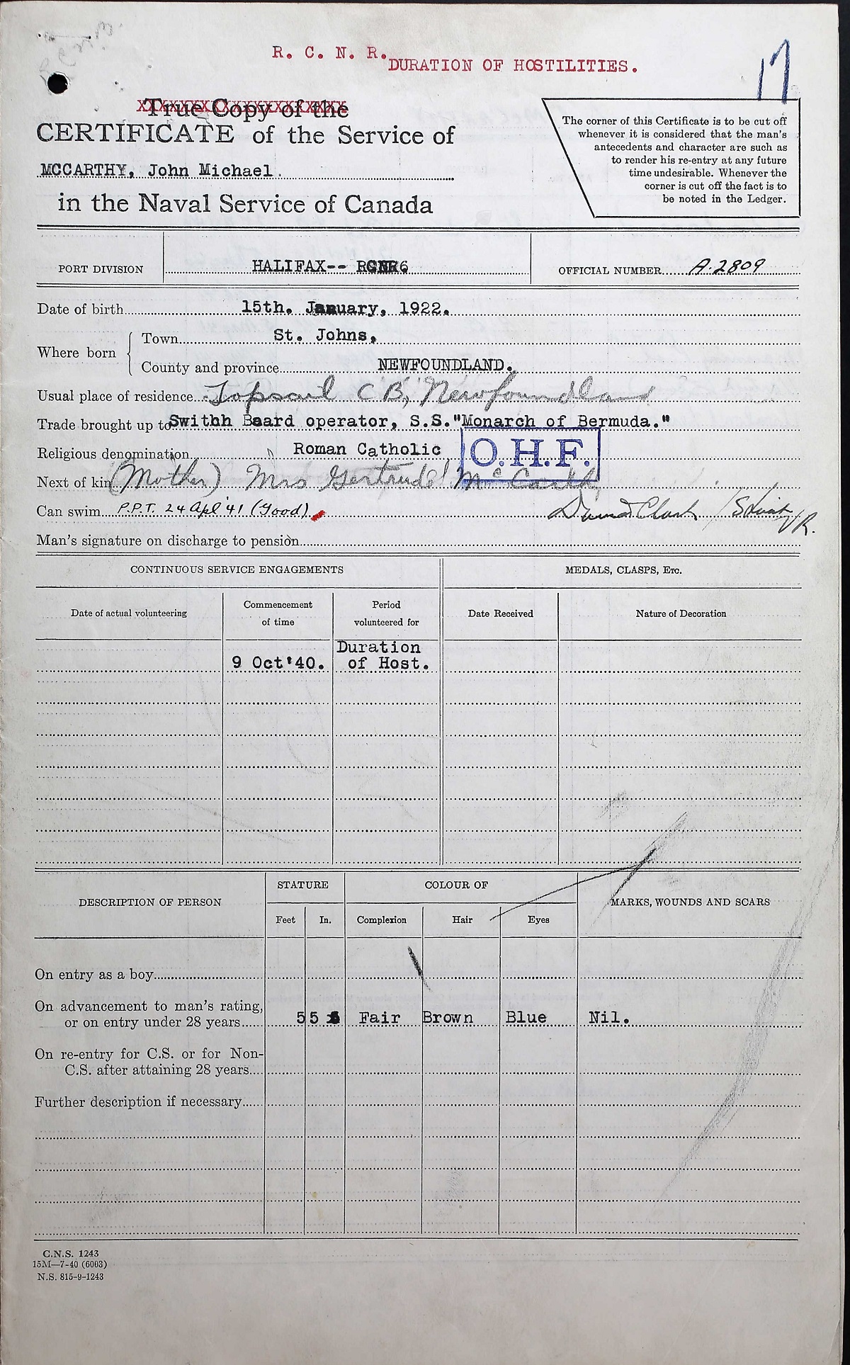 Able Seaman John Michael McCarthy was born in St. John's, Newfoundland and educated at Holy Cross School, St. John and in Corner Brook where he resided for some time. Prior to enlisting in the Navy he worked as a Switchboard operator on the SS Monarch of Bermuda.