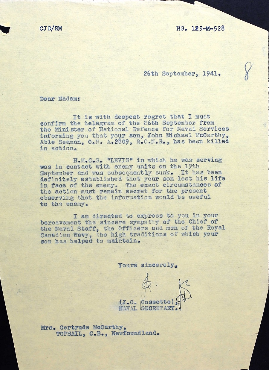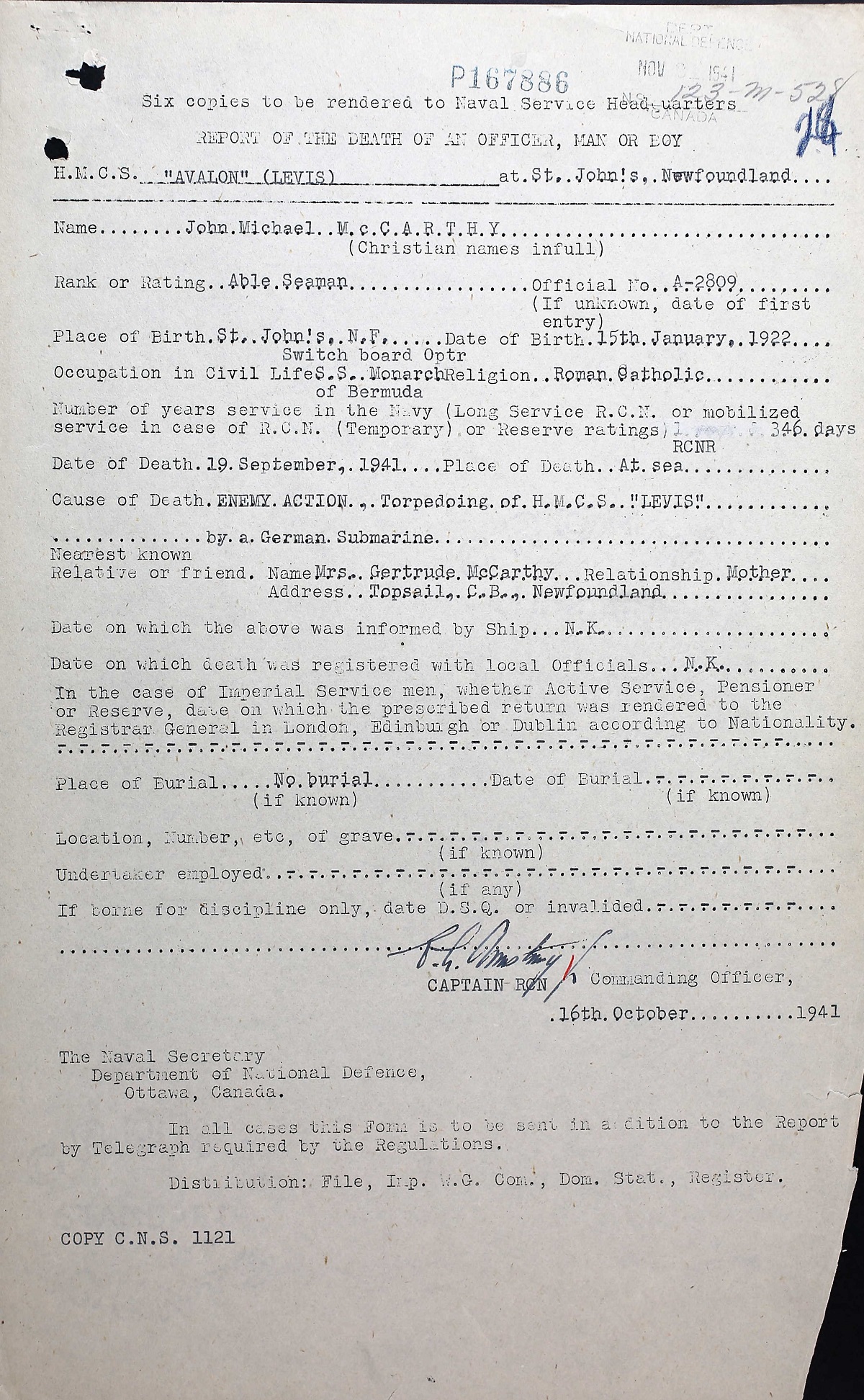 MCCARTHY, John Michael, AB, A2809, RCNR, MPK - 19 Sep 1941, HMCS LEVIS - Son of John and Gertrude McCarthy, of Topsail, Newfoundland.