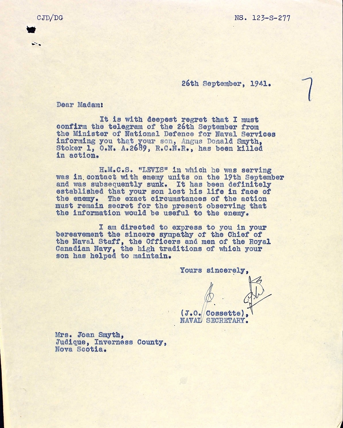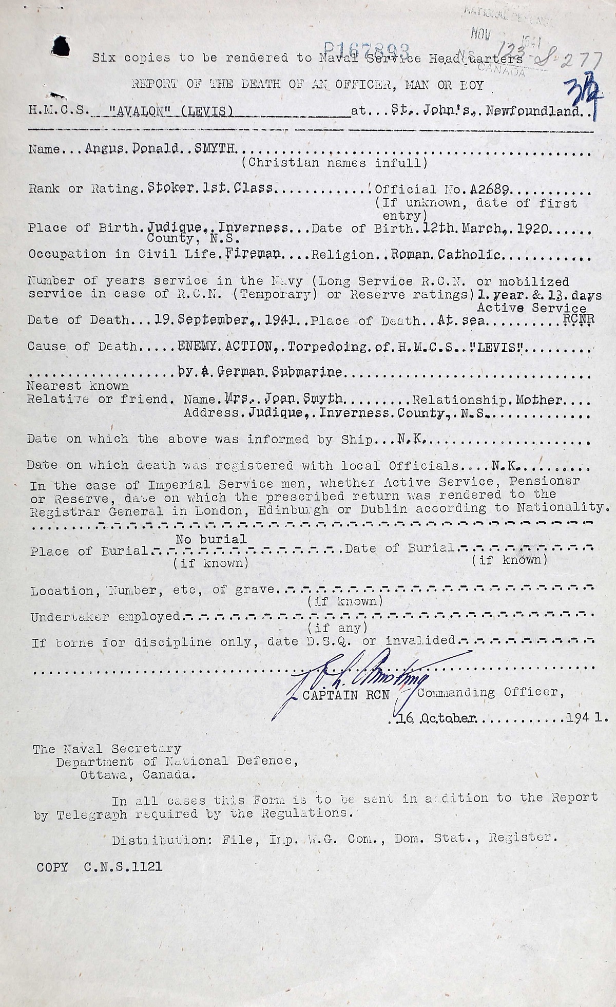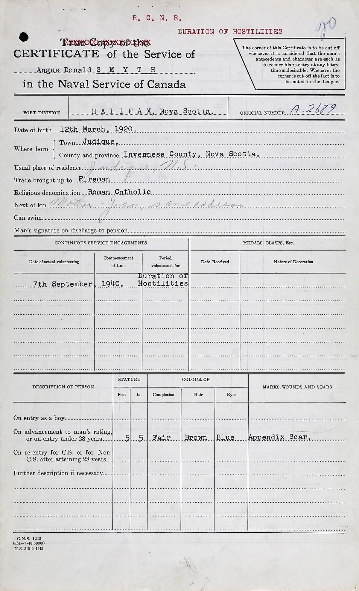 SMYTH, Angus Donald, Sto 1c, A2689, RCNR, MPK - 19 Sep 1941, HMCS LEVIS - Son of Patrick William and Joan Smyth, of Judique, Nova Scotia.