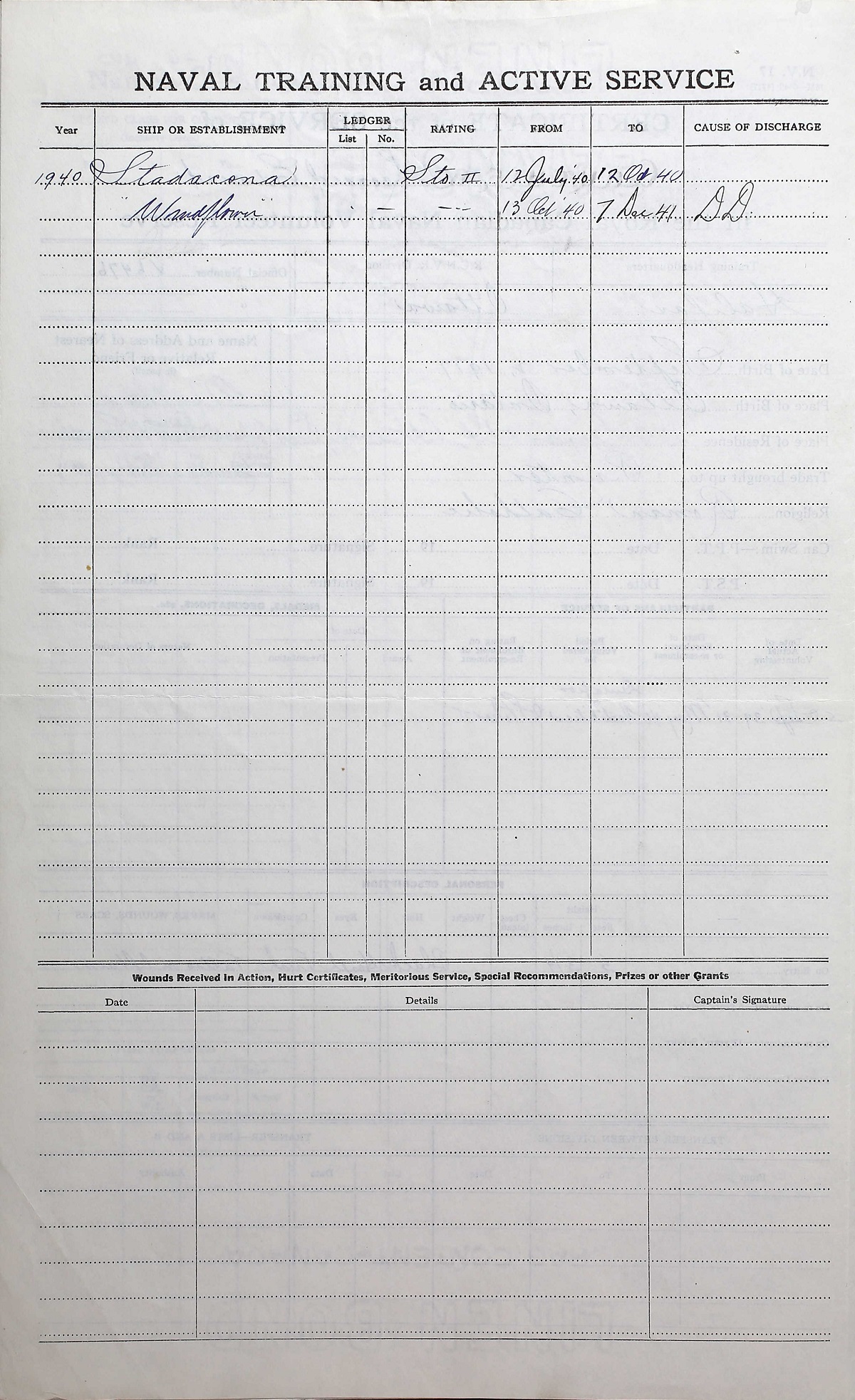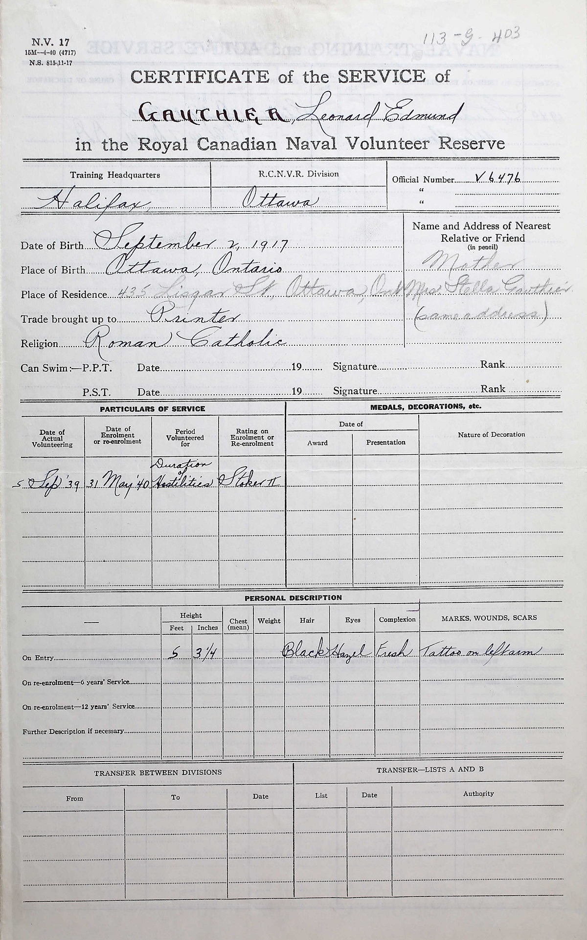 Ships served in: OTTAWA DIVISION RCNVR - Enlisted 31 May 1940. Commenced Active Service 10 Jul 1040 as a Sto 2c, RCNVR HMCS STADACONA - Drafted to STADACONA 12 Jul 1940 as a Sto 2c, RCNVR HMCS WINDFLOWER - Drafted to WINDFLOWER 13 Oct 1940 as a Sto 2c, RCNVR