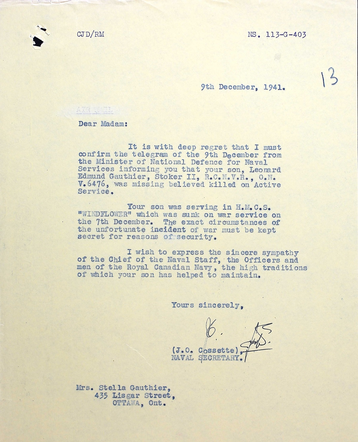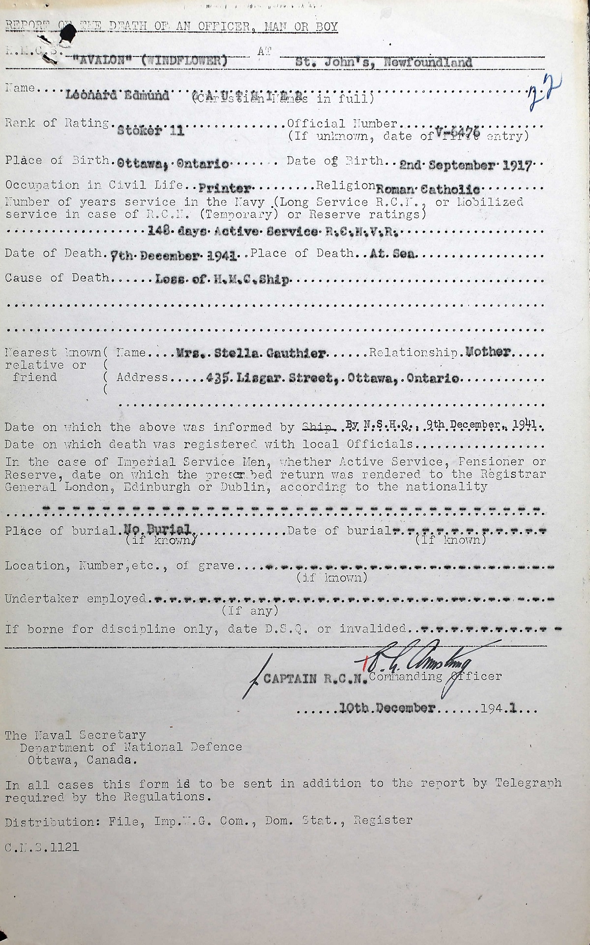 GAUTHIER, Leonard Edmund, Sto 2c, V6476, RCNVR, MPK - 07 Dec 1941, HMCS WINDFLOWER - Son of Philias and Stella Gauthier, of Ottawa, Ontario.