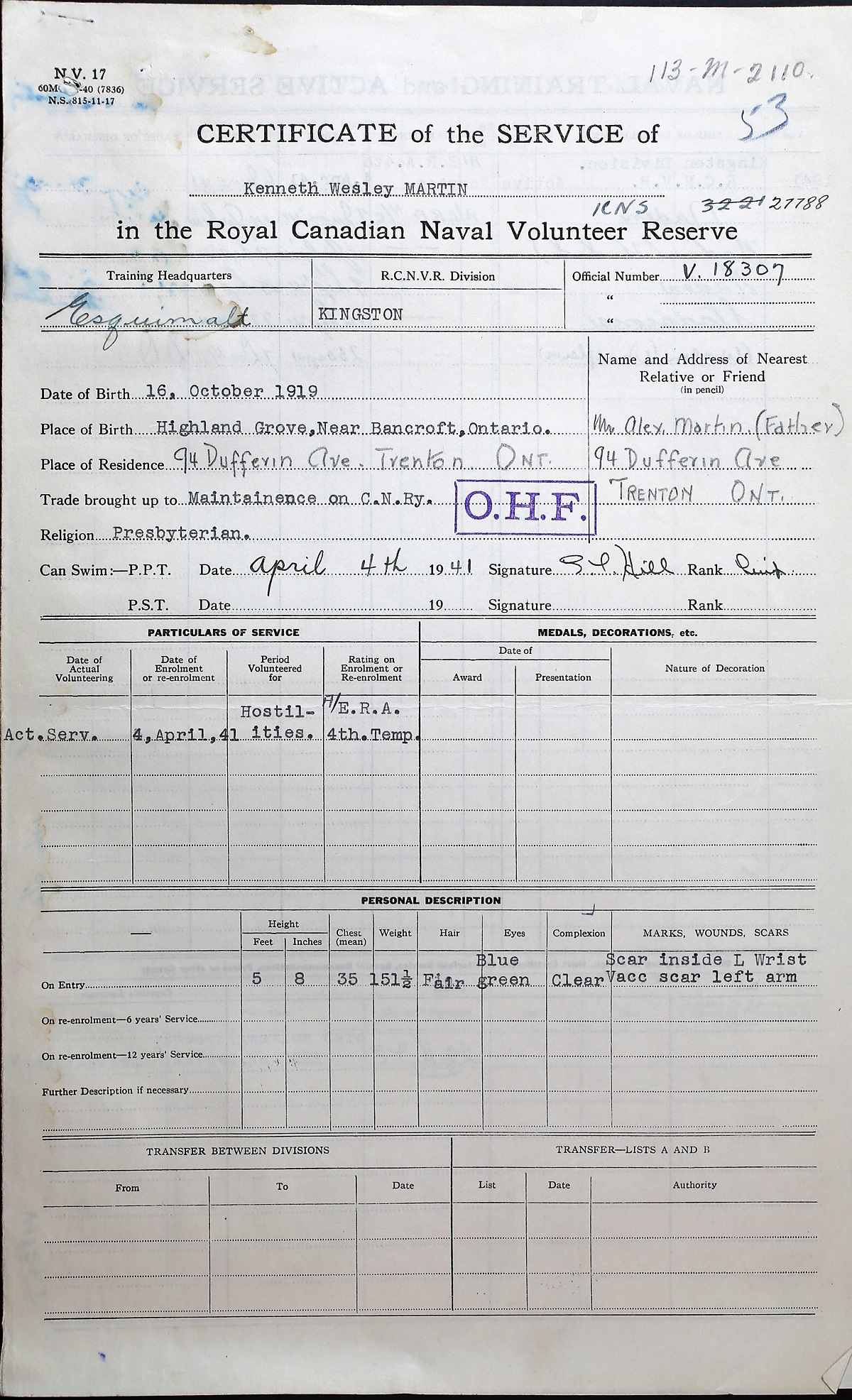 Prior to enlisting, Ken was a Sectionman for Canadian National Railway.