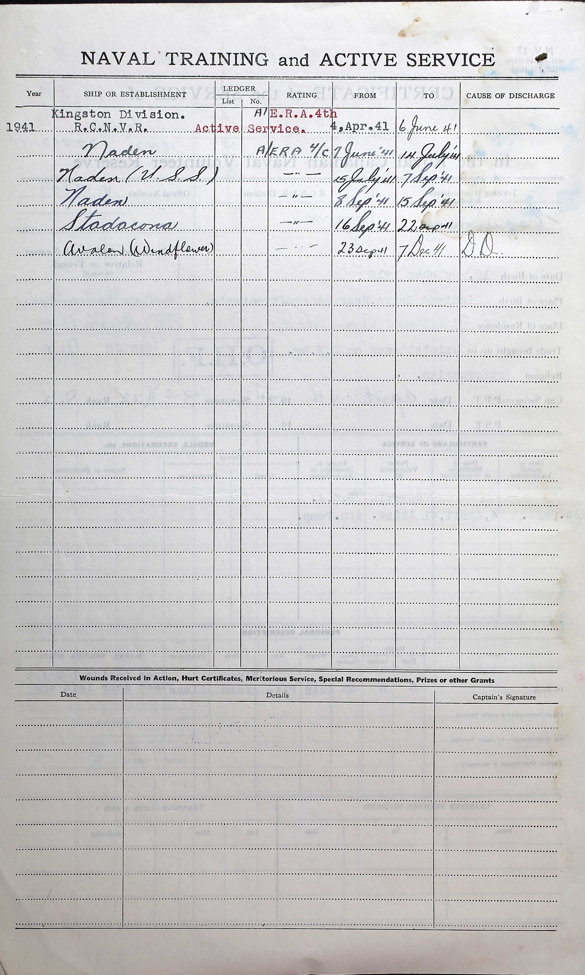 1941 as an A/ERA 4c, RCNVR HMCS NADEN - Drafted to NADEN 08 Sep 1941 as an A/ERA 4c HMCS STADACONA - Drafted to STADACONA 16 Se p1941 as an A/ERA 4c, RCNVR HMCS WINDFLOWER - Drafted to WINDFLOWER 23 Sep 1941 as an A/ERA 4c, RCNVR