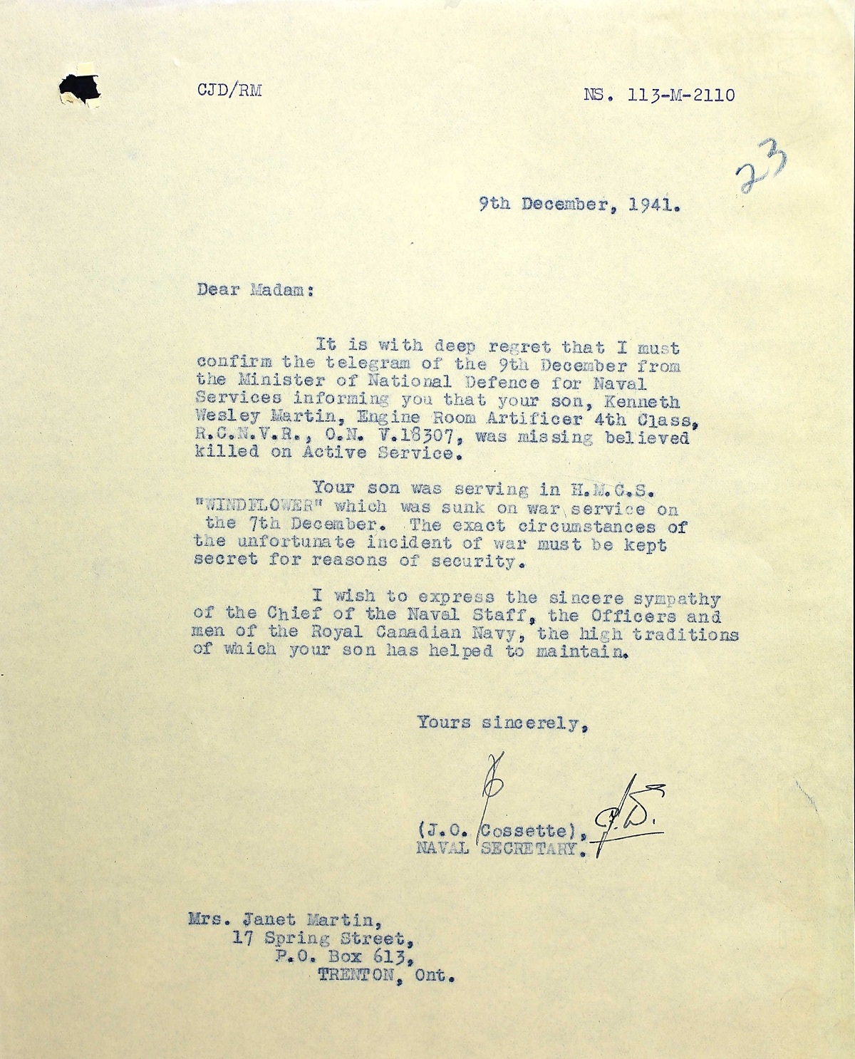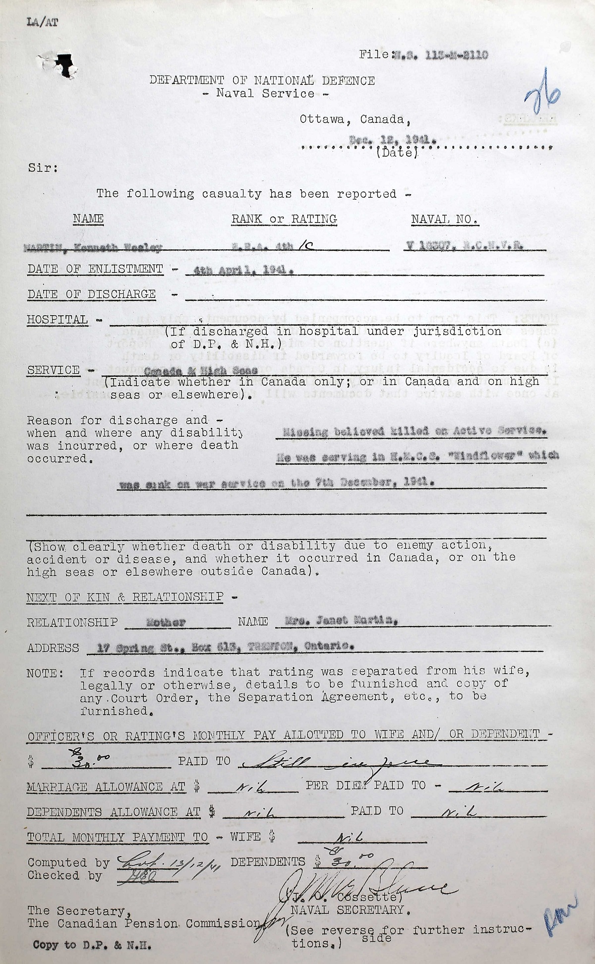 MARTIN, Kenneth Wesley, ERA 4c, V18307, RCNVR, MPK - 07 Dec 1941, HMCS WINDFLOWER - Son of Alexander and Janet E. Martin, of Trenton, Ontario.