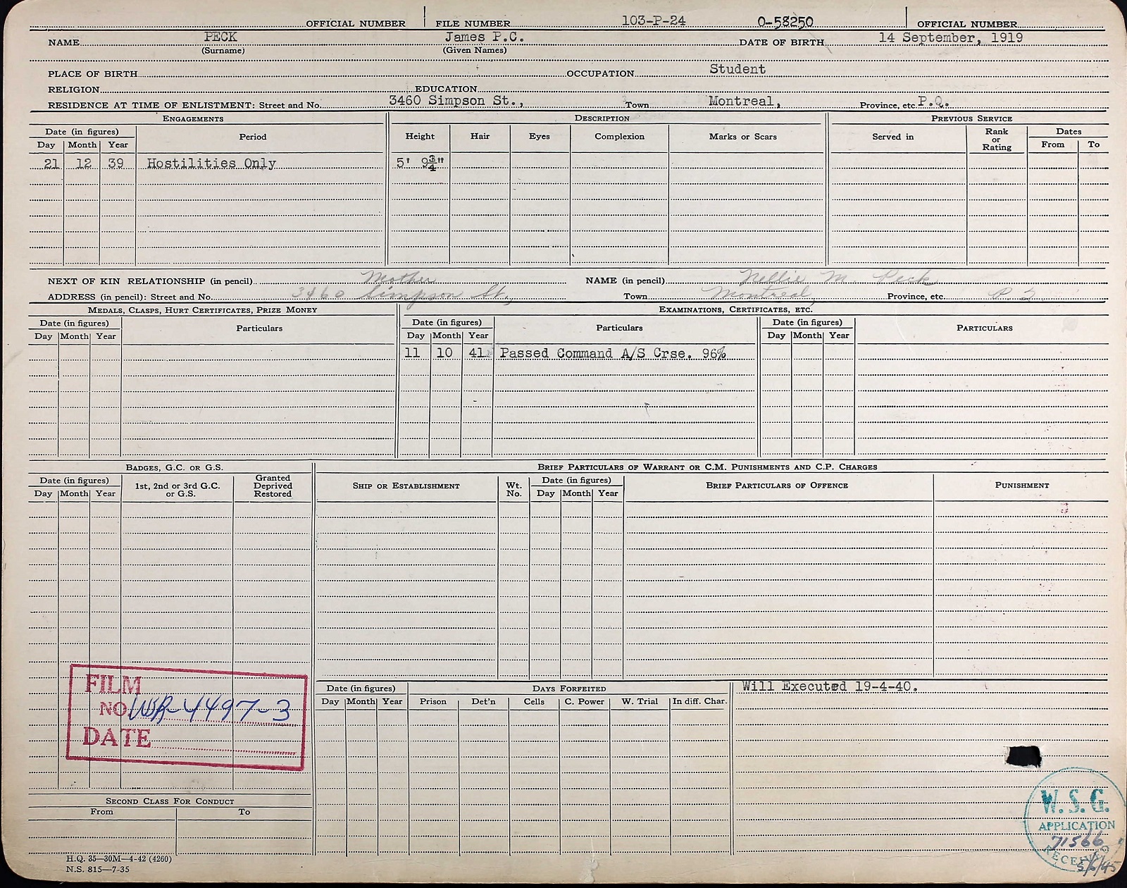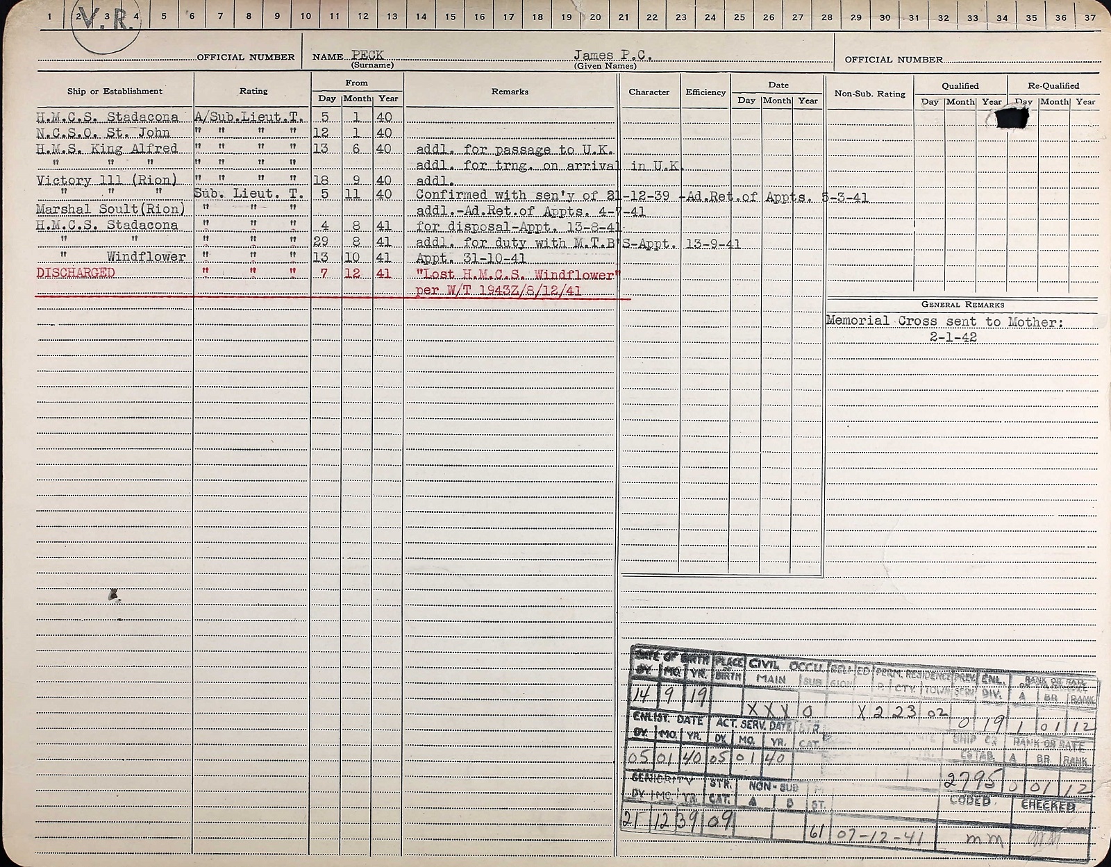 Ships served in: ROYAL MILITARY COLLEGE OF CANADA - Attended RMC 1937-1939 HMCS STADACONA - Appointed to STADACONA 05 Jan 1940 as a A/SLt, RCNVR NCSO SAINT JOHN - Appointed to NCSO SAINT JOHN 12 Jan 1940 as a A/SLT, RCNVR HMS KING ALFRED - Appointed to KING ALFRED 13 Jun 1940 add'l for passage and training as an A/SLt, RCNVR HMS VICTORY III for HMS RION - Appointed to RION 19 Sep 1940 as an A/SLT, RCNVR * Appointed SLT 05 Nov 1940 (seniority 21 Dec 1939 HMCS STADACONA - Appointed to STADACONA 04 Aug 1941 as a SLt, RCNVR for Disposal. HMCS STADACONA - Appointed to STADACONA 29 Aug 1941 as a SLt, RCNVR, add'l for duty with MTBs HMCS WINDFLOWER - Appointed to WINDFLOWER 13 Oct 1941 as a SLt, RCNVR