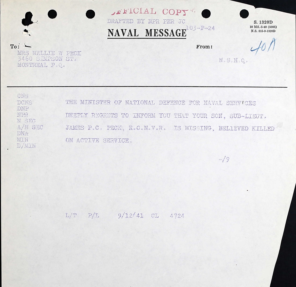 Sub-Lieutenant James P. Christopher Peck the son of the late Edmond Peck and Mrs. Peck of Montréal. Sub/Lt. Peck is reported missing and believed killed. He was educated at the Grove Lakefield Ontario, and Royal Military College, Kingston from where he went on active service in January 1940. He was on convoy duty in the English Channel from September, 1940 to July 1941 and later in Eastern Canadian water. He was 22 years of age.