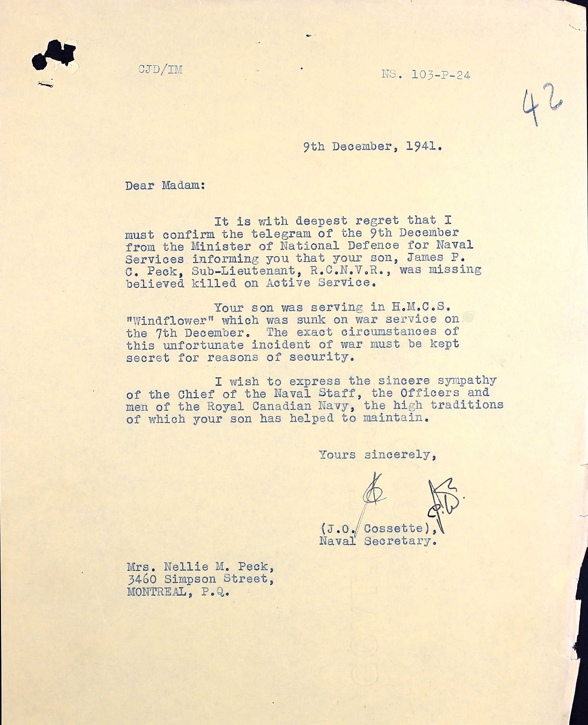 PECK, James Philip Christopher, SLt, RCNVR, MPK - 07 Dec 1941, HMCS WINDFLOWER - Son of Thomas E. Peck, and of Nellie M. Peck, of Montreal, Province of Quebec.