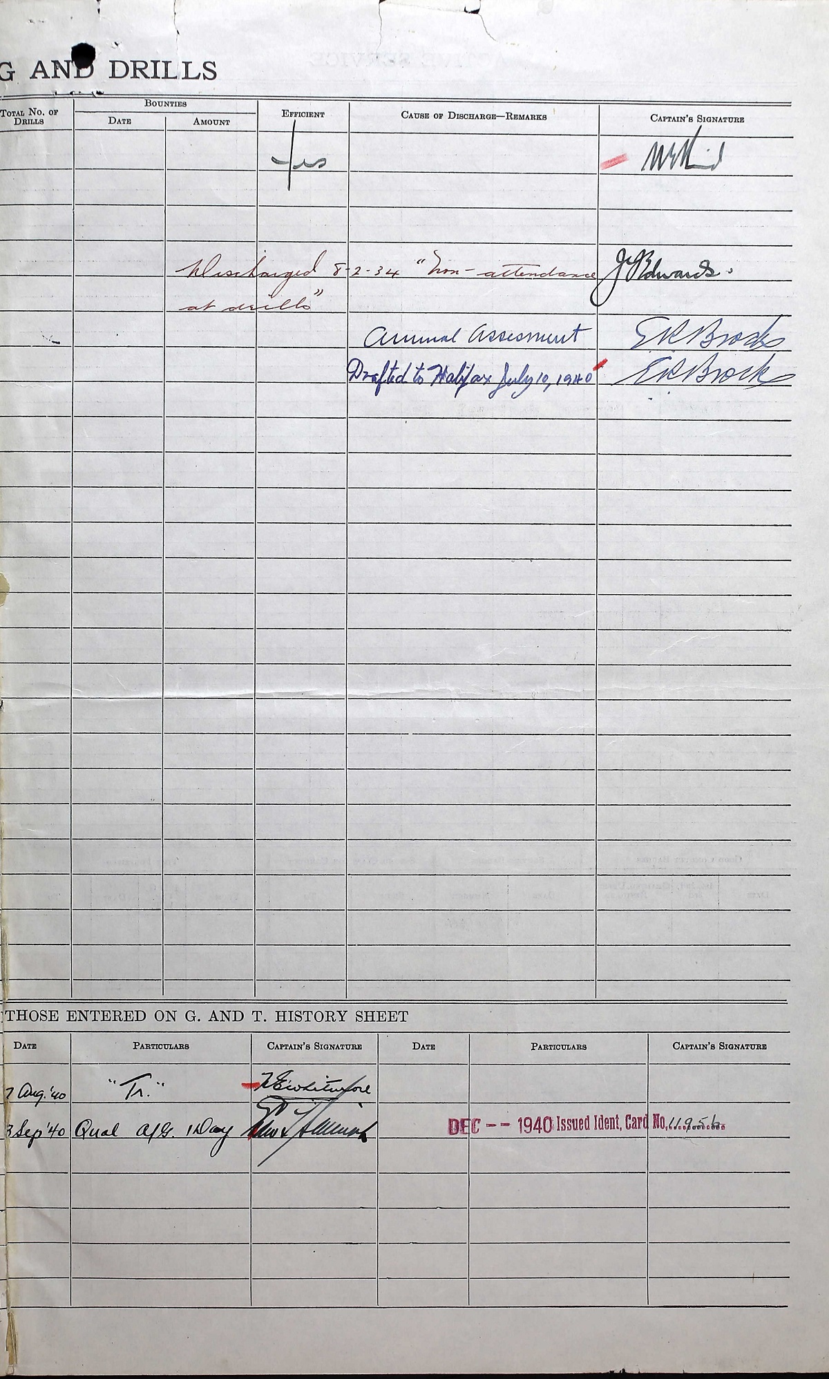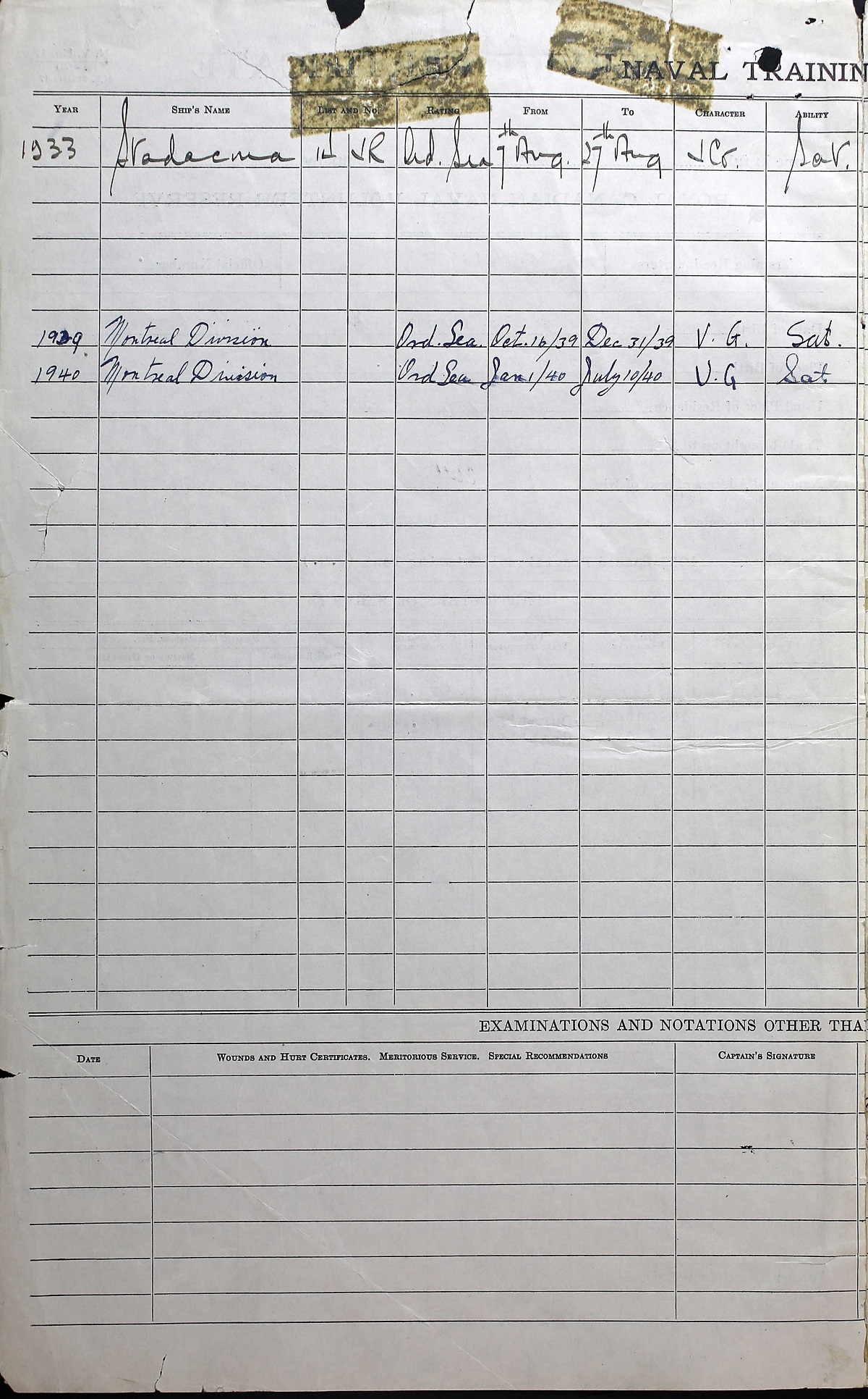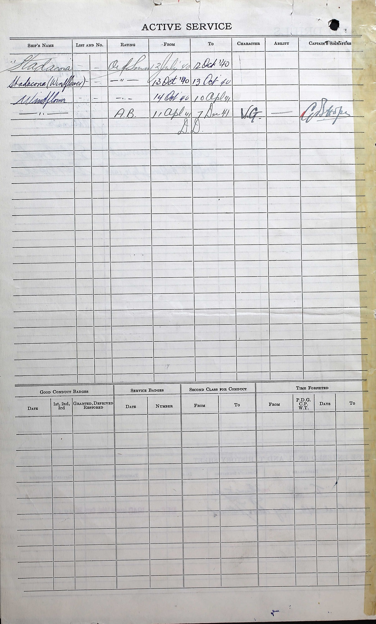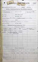 Ships served in: MONTREAL COMPANY RCNVR - Enlisted in the RCNVR 08 Feb 1933 for a period of 3 year as an OS. HMCS STADACONA - Drafted to STADACONA 06 Aug 1933 for training MONTREAL DIVISION RCNVR - Enlisted (Hostilities only) 16 Oct 1939 as an OS, RCNVR. Commenced Active Service 10 Jul 1940 HMCS STADACONA - Drafted to STADACONA 12 Jul 1940 as an OS, RCNVR HMCS WINDFLOWER -Drafted to WINDFLOWER 13 Oct 1940 as an OS, RCNVR * Rated AB 11 Apr 1941