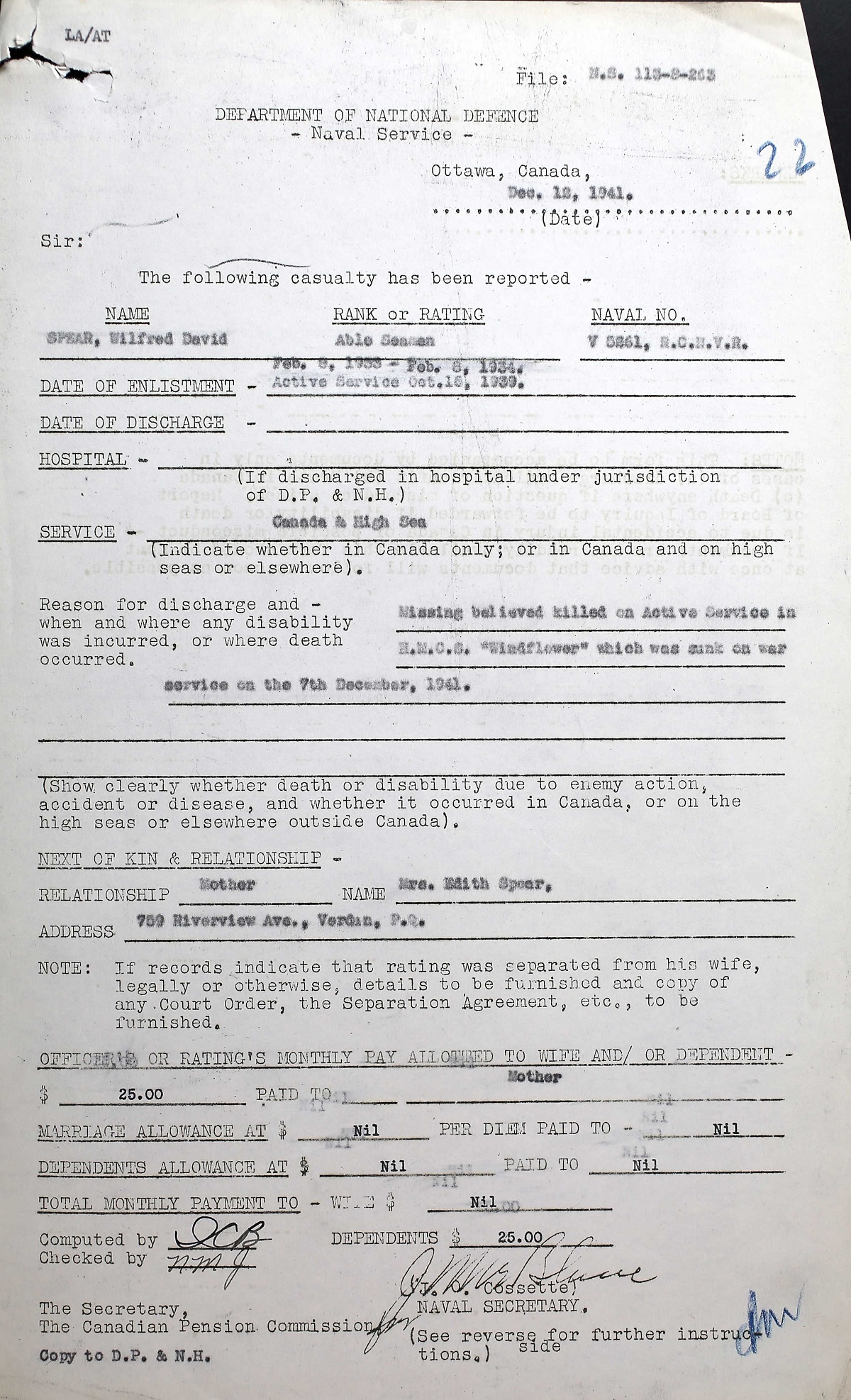 SPEAR, Wilfred David, AB, V5261, RCNVR, MPK - 07 Dec 1941, HMCS WINDFLOWER - Son of Amos Wilfred and Edith Spear, of Verdun, Province of Quebec.