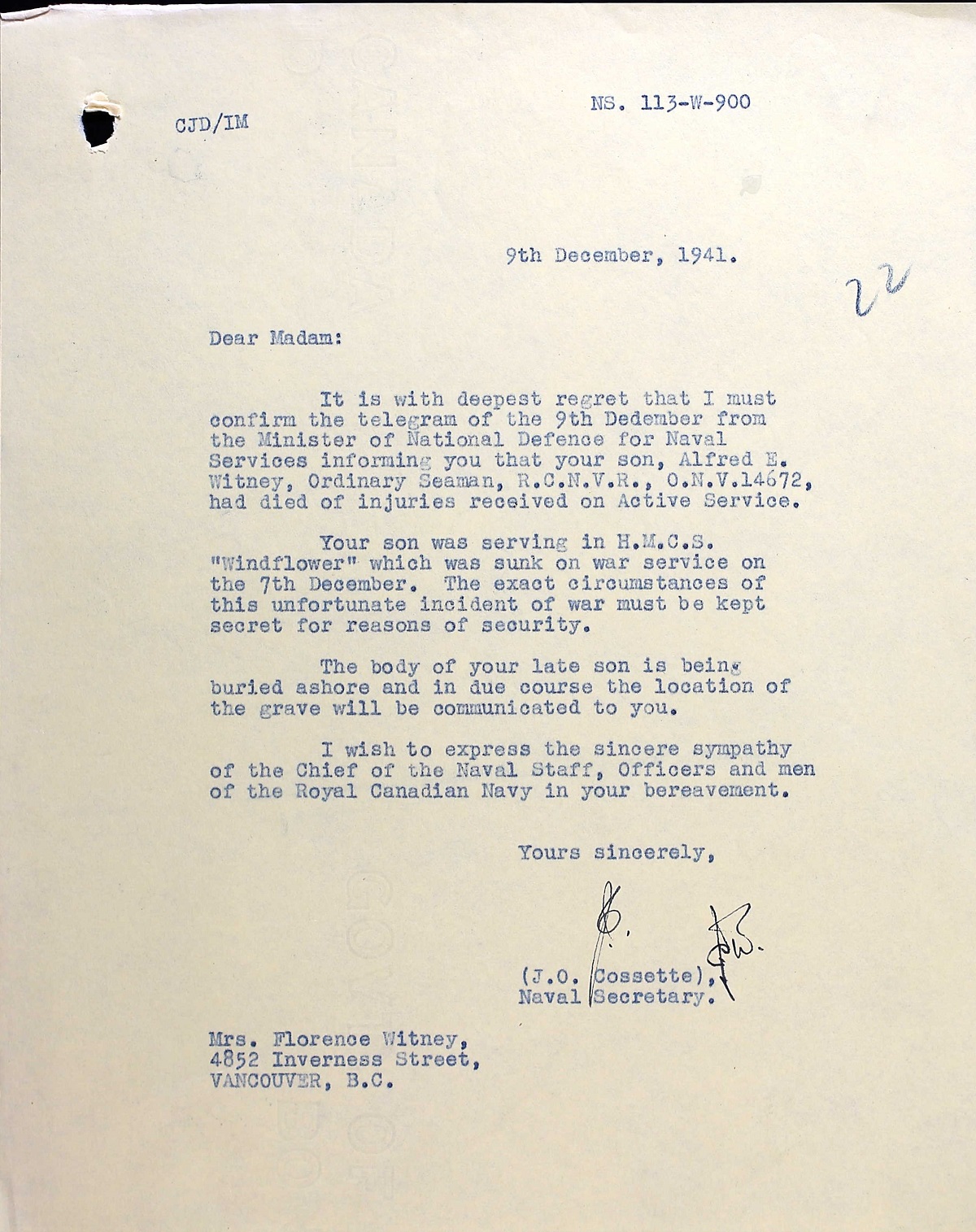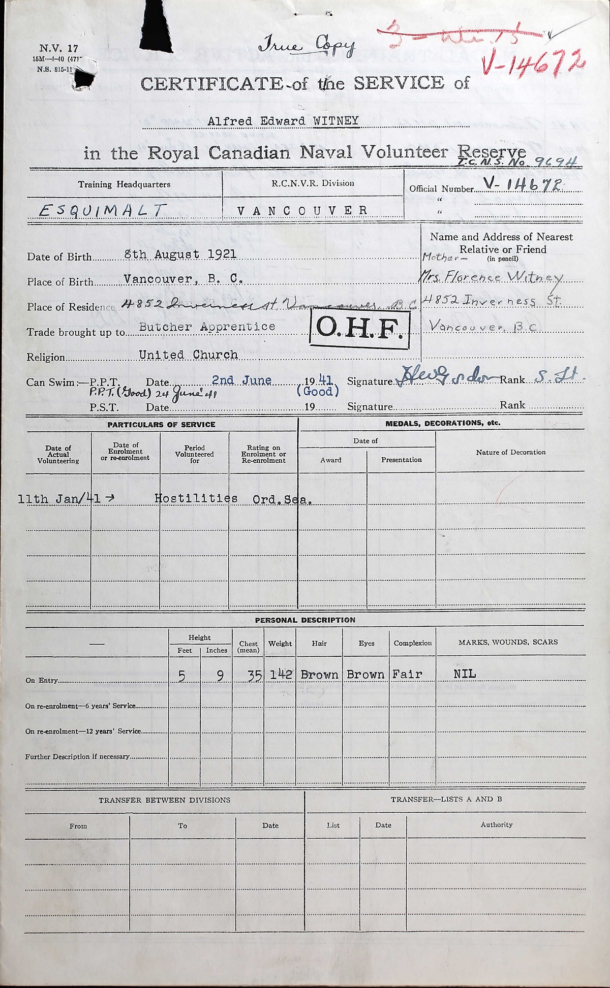 OS Witney died when HMCS WINDFLOWER sunk after being rammed by a merchant ship in convoy. His body was recovered and buried in the Mount Pleasant Cemetery, St. John's, Nfld. Prior to joining the RCNVR, Alfred Witney served for approx 4 months in the 2nd Battalion Irish Fusiliers, Vancouver Regiment, Non-Permanent Active Militia.