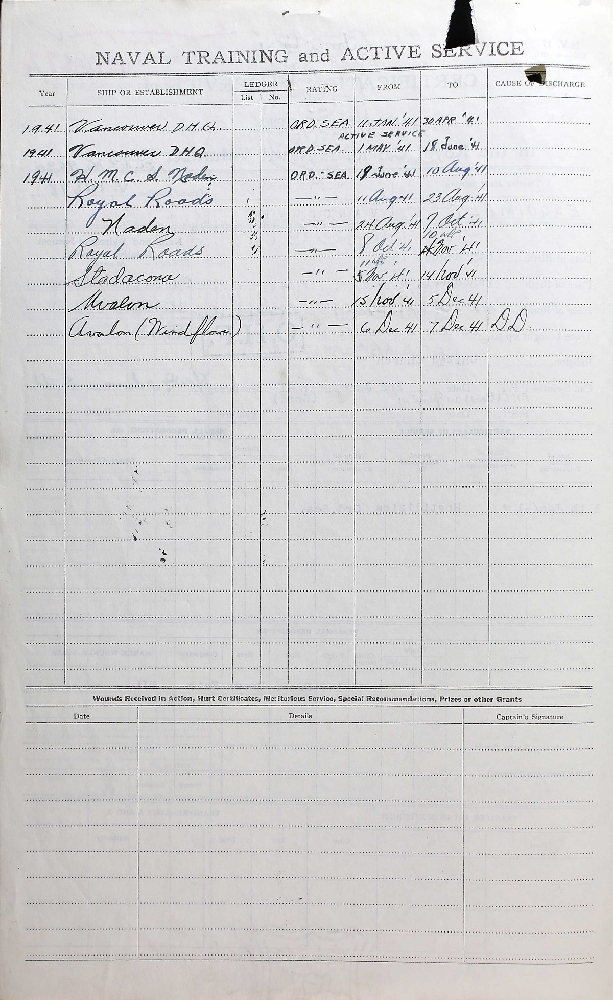 Ships served in: VANCOUVER DIVISION RCNVR - Enlisted 11 Jan 1941. Commenced Active Service 01 May 1941 as an OS, RCNVR HMCS NADEN - Drafted to NADEN 19 Jun 1941 as an OS, RCNVR HMCS ROYAL ROADS - Drafted to ROYAL ROADS 11 Aug 1941 as an OS, RCNVR HMCS NADEN - Drafted to NADEN 24 Aug 1941 as an OS, RCNVR HMCS ROYAL ROADS - Drafted to ROYAL ROADS 08 Oct 1941 as an OS, RCNVR HMCS STADACONA - Drafted to STADACONA 11 Nov 1941 as an OS, RCNVR HMCS AVALON - Drafted to AVALON 15 Nov 1941 as an OS, RCNVR HMCS WINDFLOWER - Drafted to WINDFLOWER 06 Dec 1941 as an OS, RCNVR