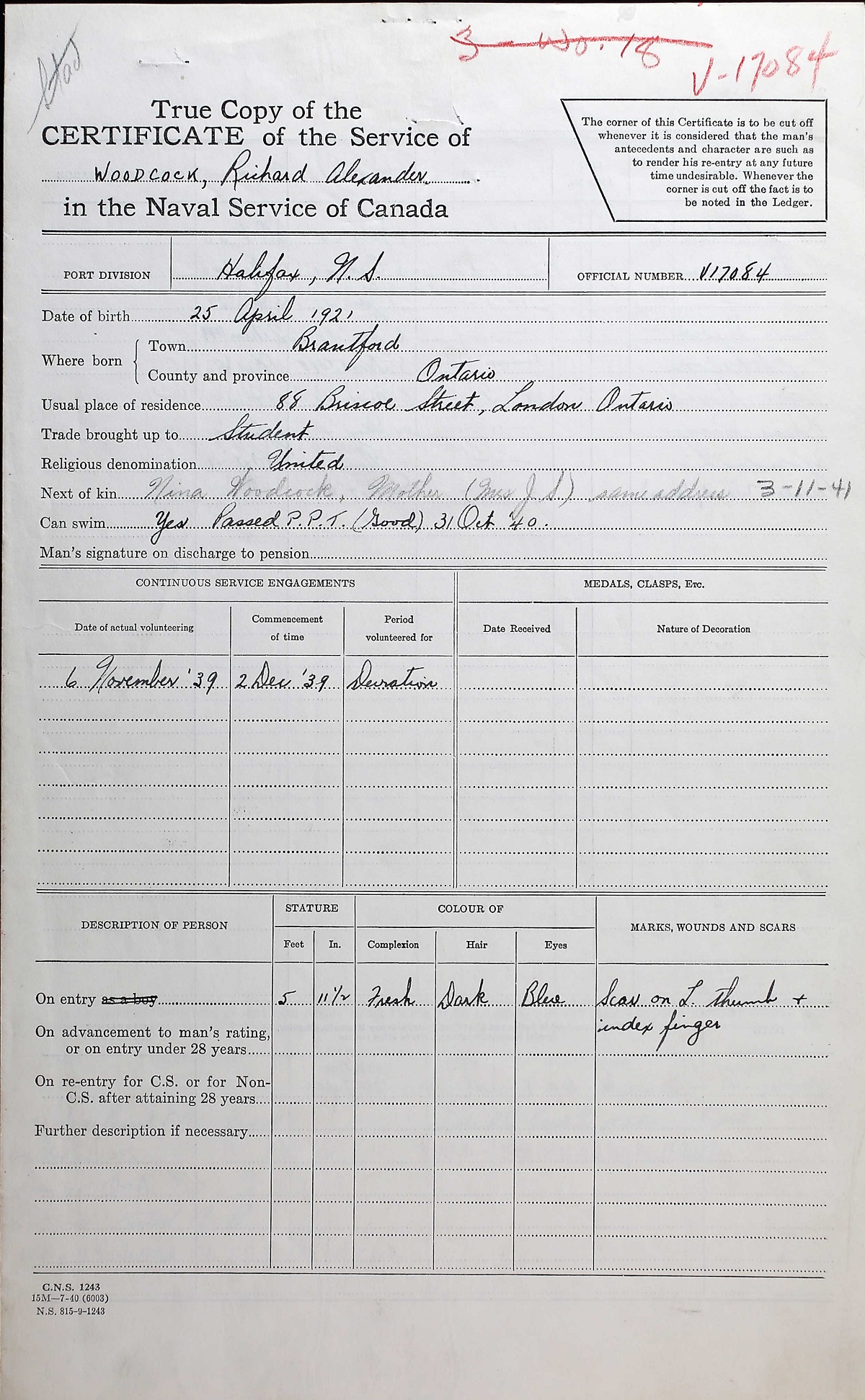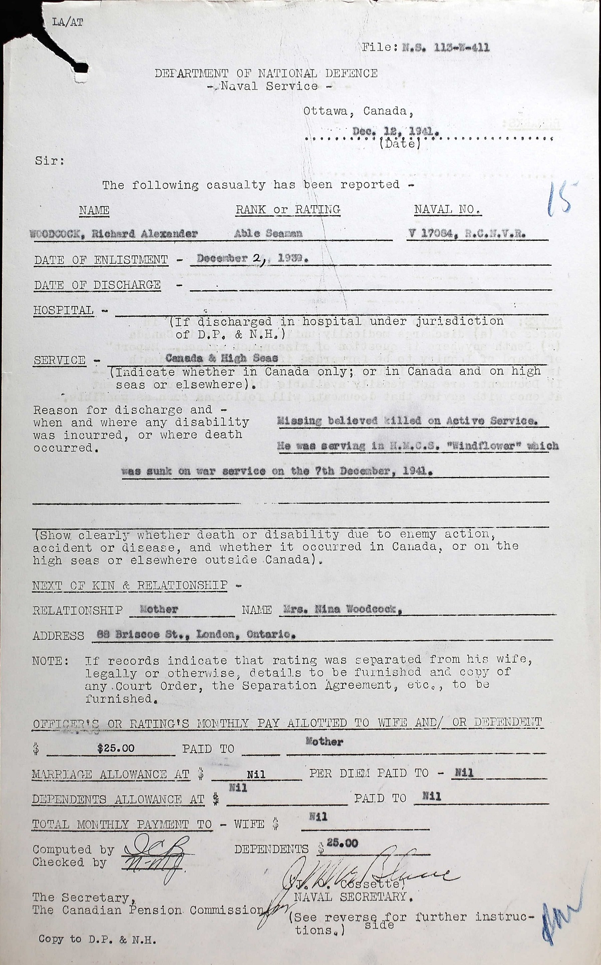 WOODCOCK, Richard Alexander, AB, V17084, RCNVR, MPK - 07 Dec 1941, HMCS WINDFLOWER - Son of John Sidney and Nina Woodcock, of London, Ontario.