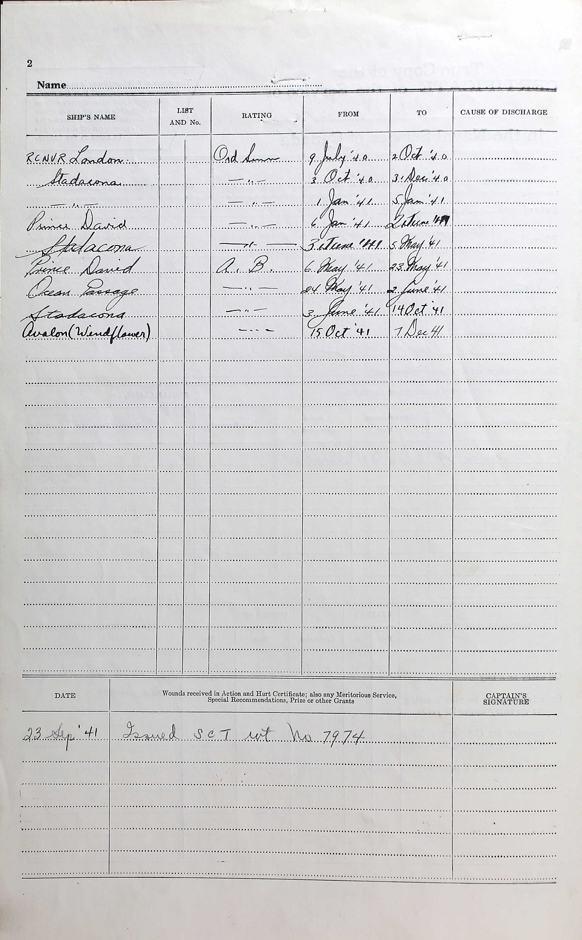 Ships served in: LONDON DIVISION RCNVR - Enlisted 02 Dec 1939. Commenced Active Service 09 Jul 1940 * Rated A/ST 03 Jan 1941 HMCS PRINCE DAVID - Served in PRINCE DAVID 06 Jan 1941 - 23 May 1941 as an OS, RCNVR * Rated AB 06 May 1941 * Ocean Passage, Esquimalt to Halifax (vessel not known) - 24 May 1941 - 02 Jun 1941 HMCS STADACONA - Drafted to STADACONA 03 Jun 1941 as an AB, RCNVR * Rated LTO 22 Sep 1941 HMCS WINDFLOWER - Drafted to WINDFLOWER 15 Oct 1941 as an AB, RCNVR