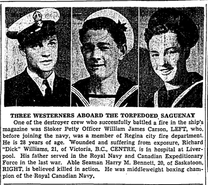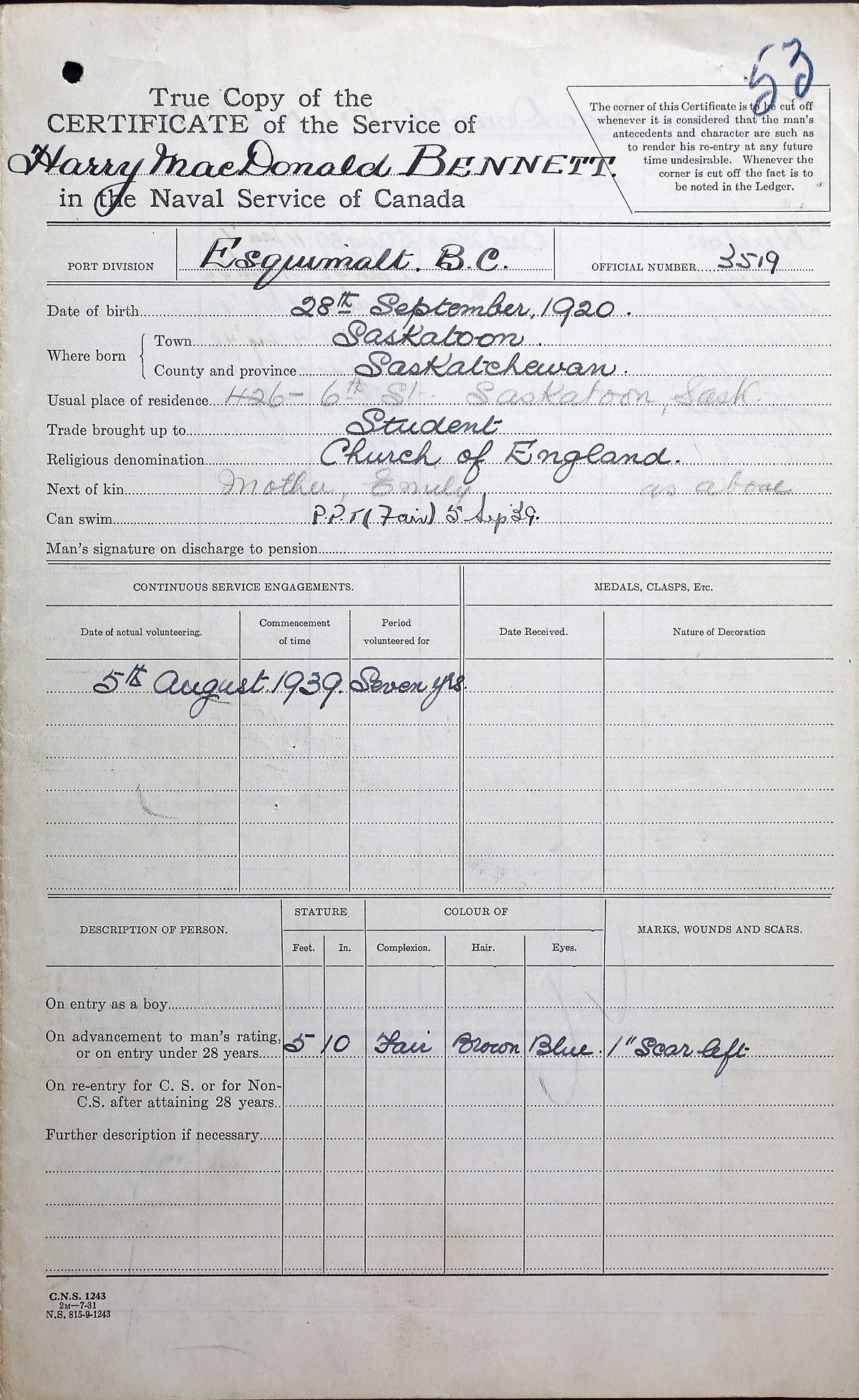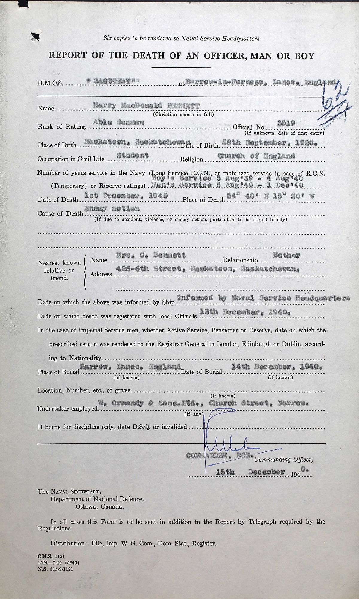 Harry Bennett was born at Saskatoon, Saskatchewan and was a student when he enlisted on August 05, 1939, Esquimalt, British Columbia a month before the war broke out. He was the middleweight boxing champion of the Royal Canadian Navy. AB Bennett was killed when HMCS SAGUENAY, while escorting convoy HG.47, was torpedoed by the Italian submarine Argo 300 miles west of Ireland. With her bows wrecked and 21 dead, SAGUENAY made Barrow-in-Furness largely under her own power, and was under repairs until 22 May 1941. His body was recovered and he was buried in Barrow, Lancashire, England on 14 Dec 1940.