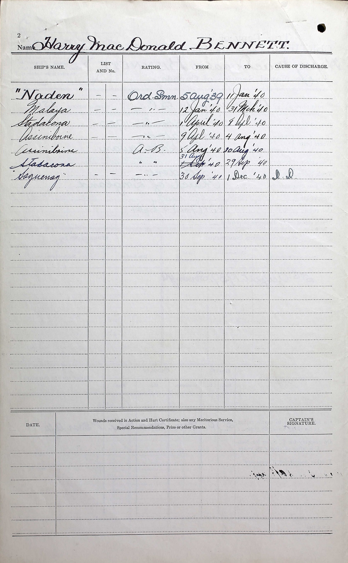 Ships served in: HMCS NADEN - Enlisted 05 Aug 1939 as an OS, RCN HMS MALAYA - Served in MALAYA 12 Jan 1940 - 31 Mar 1940 as an OS, RCN HMCS STADACONA - Drafted to STADACONA 01 Apr 1940 as an OS, RCN HMCS ASSINIBOINE - Served in ASSINIBOINE 09 Apr 1940 - 30 Aug 1940 as an OS and AB, RCN * Rated AB 05 Aug 1940 HMCS STADACONA - Drafted to STADACONA 31 Aug 1940 as an AB, RCN HMCS SAGUENAY - Drafted to SAGUENAY 30 Sep 1941 as an AB, RCN
