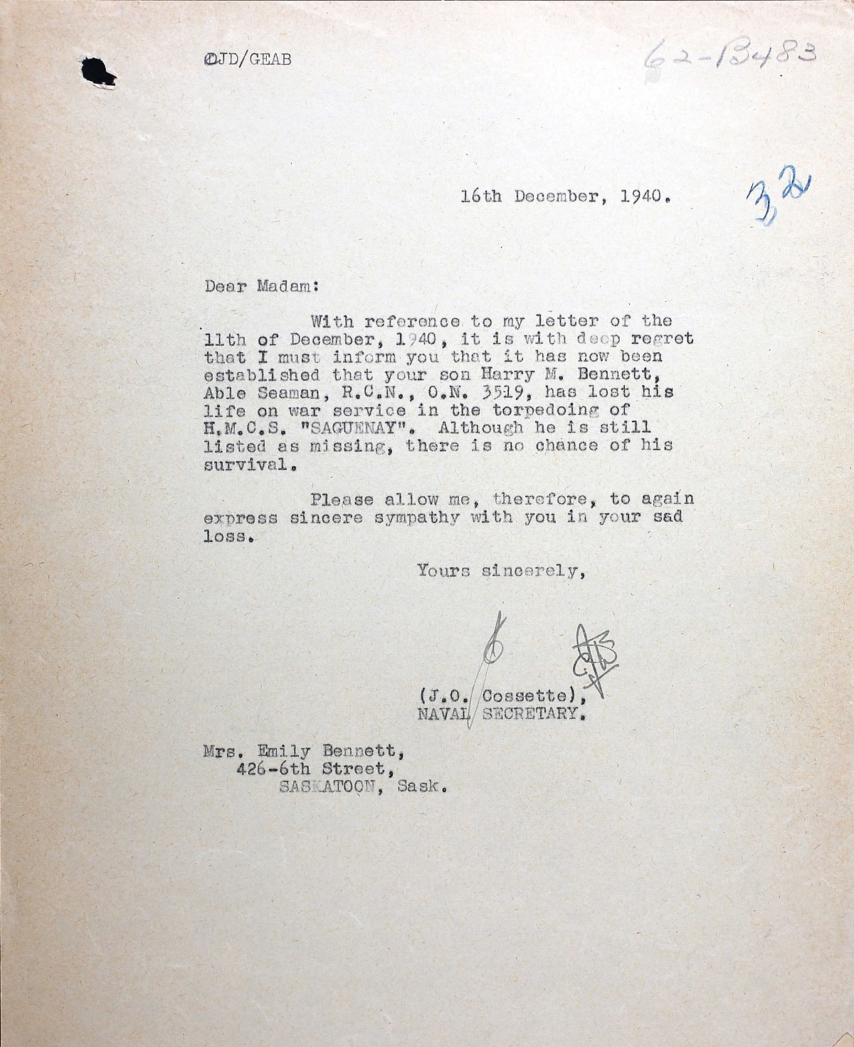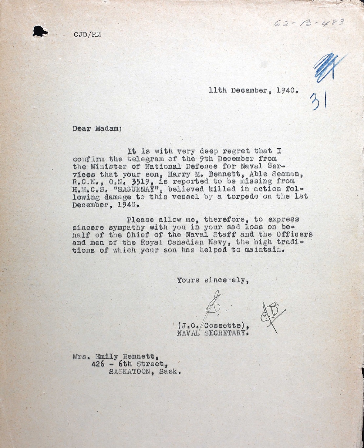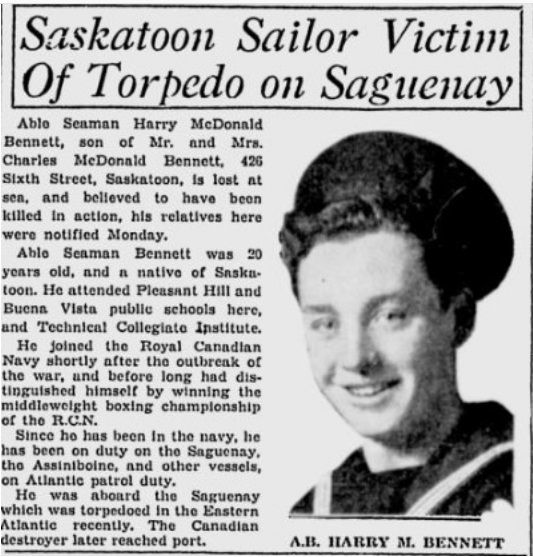 BENNETT, Harry MacDonald, AB, 3519, RCN, killed - 01 Dec 1940, HMCS SAGUENAY - Son of Charles M. and Evelyn Bennett, of Saskatoon, Saskatchewan.