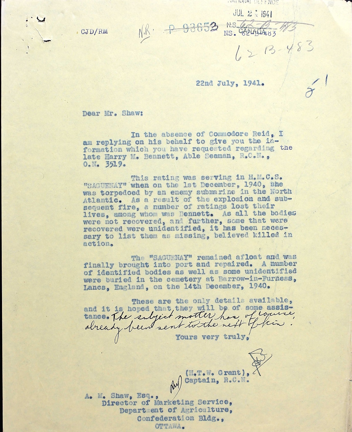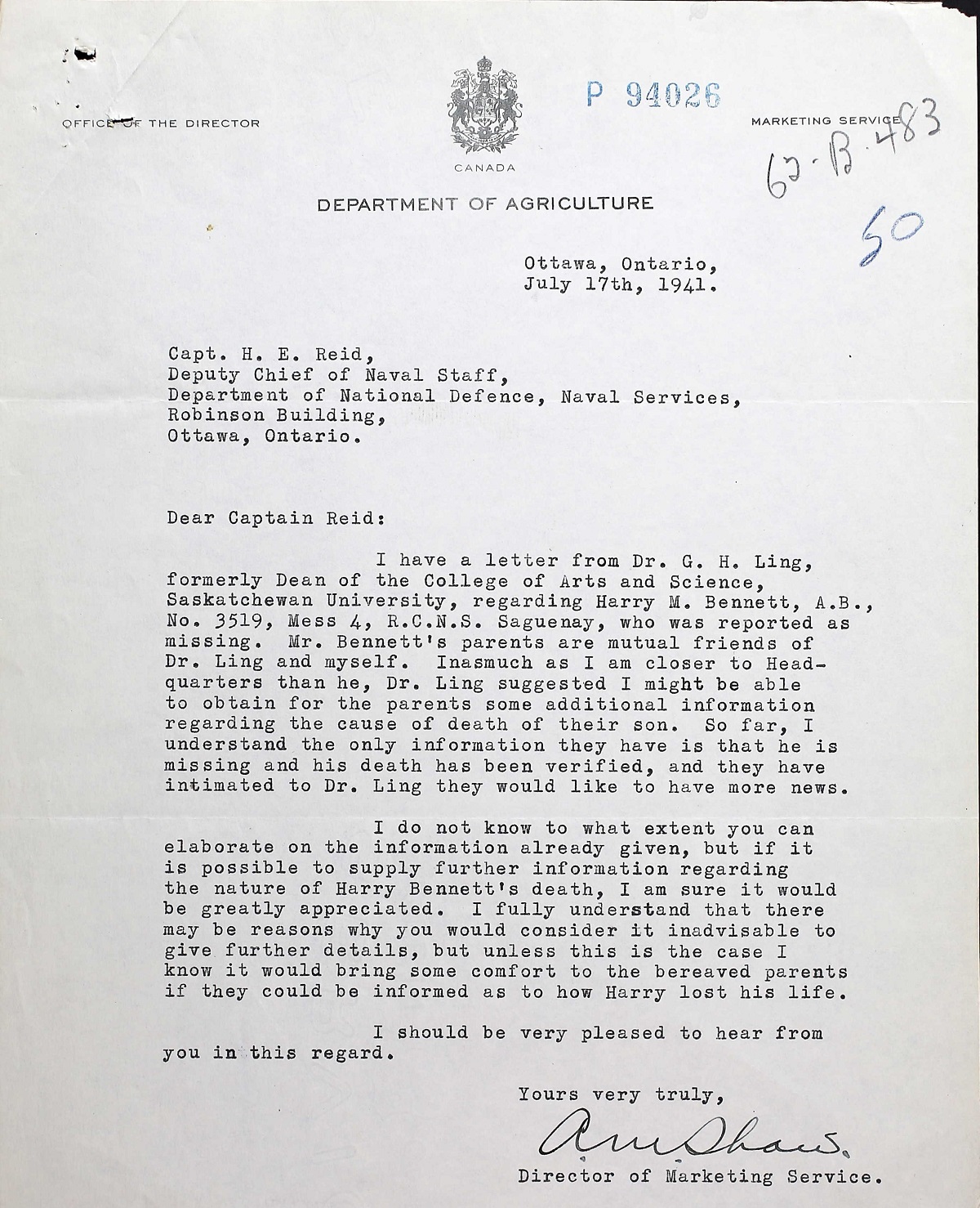 (HB06-HB07) Letter from Mr. A.W. Shaw, Director of Marketing Services, Ottawa and friend of the parents of AB Bennett to the Deputy Chief of Naval Staff inquiring about more info on the death of AB Bennett on behalf of his parents - and the reply to Mr. Shaw.