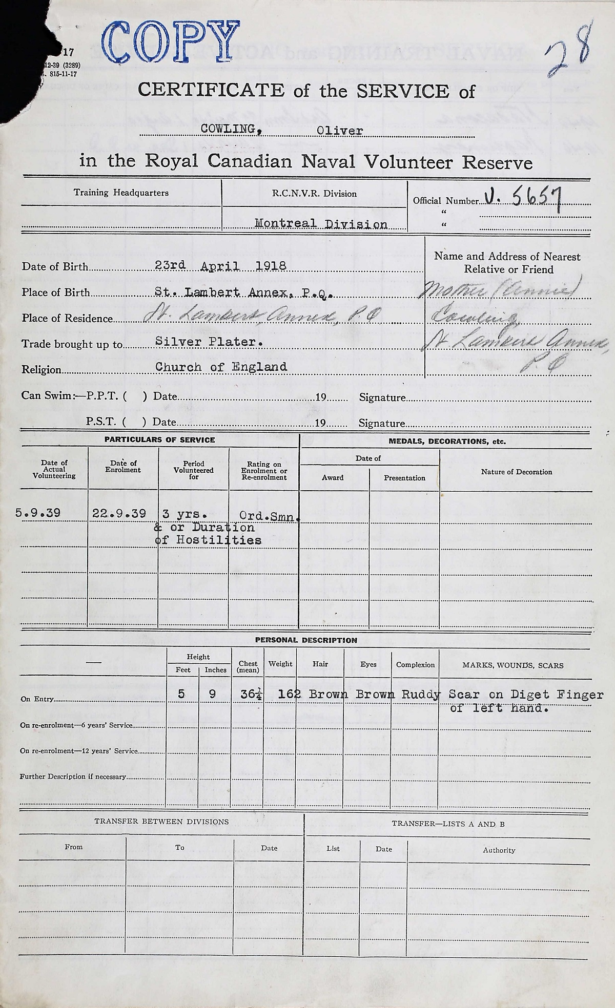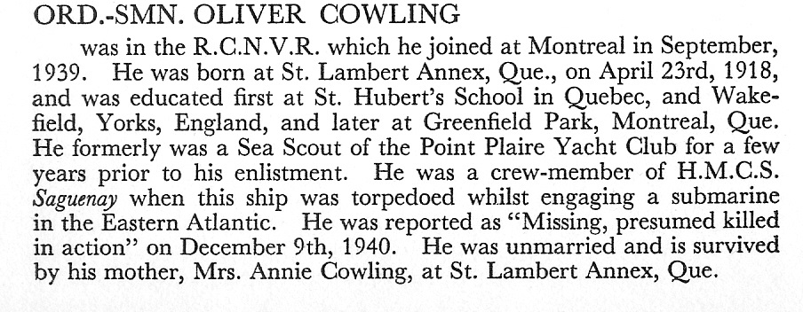COWLING, Oliver, OS, V5657, RCNVR, killed - 01 Dec 1940, HMCS SAGUENAY - Son of Harry and Alice Cowling, and stepson of Annie Cowling, of St. Lambert Annex, Chambly County, QC. Brother of Harry and John. Half-brother of Elizabeth, Winnifred and Stella.