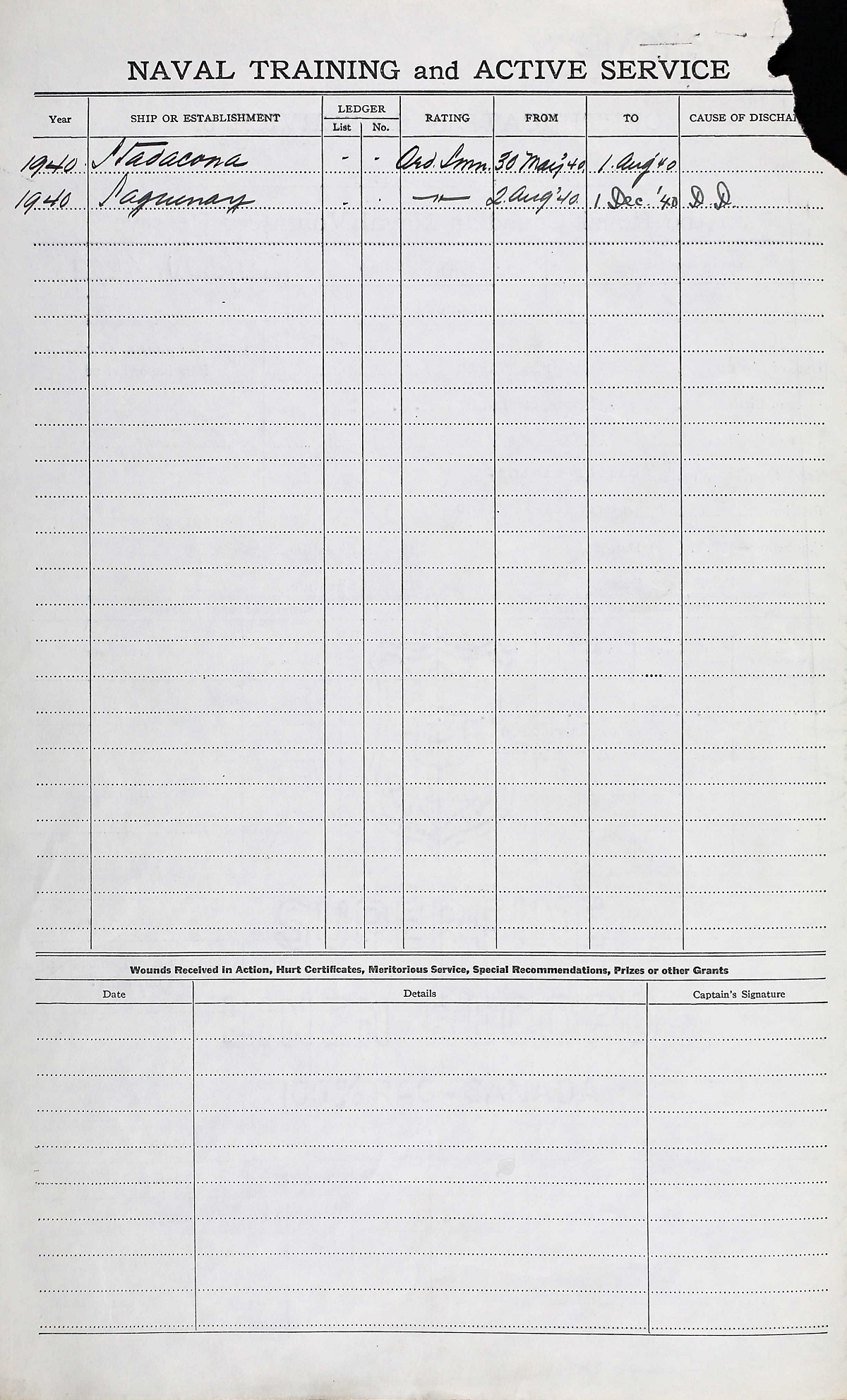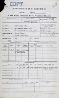 Ships served in: MONTREAL DIVISION RCNVR - Enlisted 05 Sep 1939. Commenced Active Service 22 Sep 1939. Note: The preceding dates are from his Certificate of Service. His attestation form has 22 Nov 1939 as date for Commencement of Service. His Canadian Active Service Force form has a report for duty date of 17 May 1940. Lastly his Report of Death has him commencing service on 30 Apr 1940. HMCS STADACONA - Drafted to STADACONA 30 May 1940 as an OS, RCNVR SPECIAL SERVICE DIVISION RCNVR - Recorded on the books of the Special Service Division RCNVR 31 May 1940 HMCS SAGUENAY - Drafted to SAGUENAY 02 Aug 1940 as an OS, RCNVR