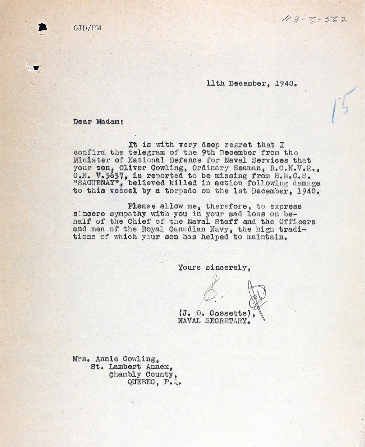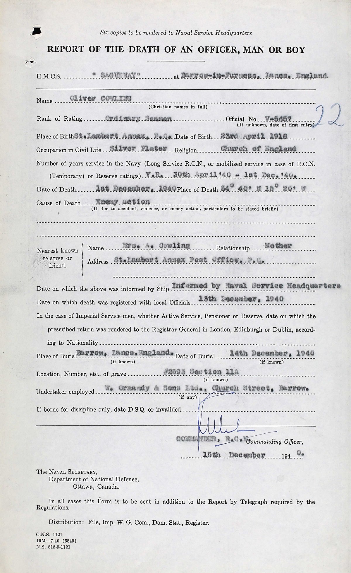 OS Cowling was killed when HMCS SAGUENAY, while escorting convoy HG.47, was torpedoed by the Italian submarine Argo 300 miles west of Ireland. With her bows wrecked and 21 dead, SAGUENAY made Barrow-in-Furness largely under her own power, and was under repairs until 22 May 1941. His body was recovered and he was buried in Barrow, Lancashire, England on 14 Dec 1940.